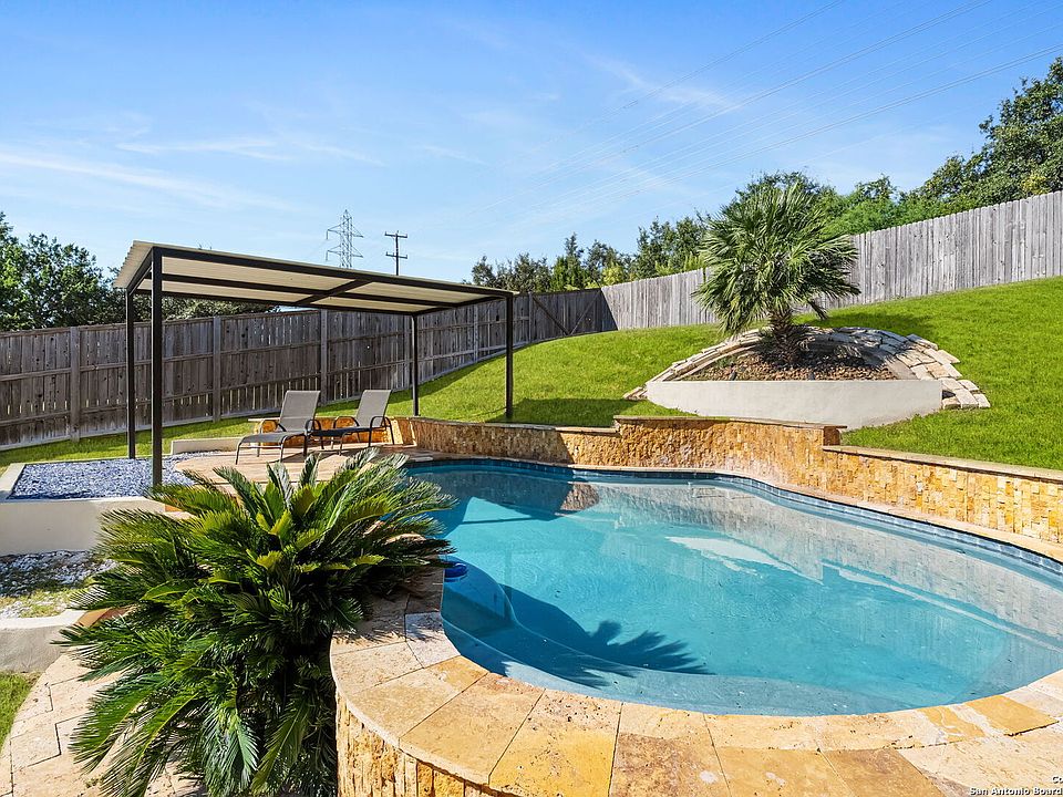 Everyday staycation living awaits the highly sought-after The Renaissance at The Vineyard community with this rare find and a few chances in the neighborhood to enjoy the luxury of your own private pool on a 0.29-acre greenbelt lot built by Broll Homes. This is the one! Architecturally striking with soaring vaulted ceilings and an open-concept design, this one-story residence combines the luxury of a well-maintained home. Located less than 1.5 miles outside Loop 1604, between Rogers Ranch and Huebner Rd, this property combines a prime location with timeless architectural charm. Step inside and discover a thoughtfully designed floor plan offering three spacious bedrooms, two full baths, one half bath, a formal dining room, and a dedicated study. A unique oversized storage space above the garage offers tremendous potential. With the addition of an AC unit, this area can easily transform into another entertainment room, game room, or media retreat, adding even greater versatility to the home. The family room with soaring vaulted tray design ceilings seamlessly flows into the chef's kitchen, where upgraded finishes and an open breakfast area create an inviting hub for everyday living and entertaining. The kitchen includes granite countertops, an electric stove and oven range with a wall-mounted range hood, subway tile backsplash, and some glass-front white cabinetry with handles. The spacious primary suite with a bay window that adds space overlooks the pool, and the en-suite spa-like bathroom features a walk-in shower, tub, double granite countertop sinks, and a walk-in closet. Vaulted ceilings extend outside into the covered patio with a ceiling fan, white aluminum privacy shutters, and louvered folding doors, where the sparkling private pool awaits. A stone pathway leads to the pool, the striking centerpiece of the backyard, featuring a sleek modern design framed by two covered cabanas that provide shade and create the perfect year-round retreat. Also comes with gutters and a water irrigation system in the front and back. Upgrades done after purchase you'll appreciate: replaced carpet in the bedrooms with wood flooring, chandeliers, painted cabinets white, and changed kitchen backsplash to subway tile. Life in the Renaissance community is more than just homeownership; it's a lifestyle. Residents enjoy low HOA fees and access to premier amenities, including a vibrant community centered around connection, wellness, and lifestyle amenities. Enjoy a community pool, basketball court, playground, and programs like the Vineyard Vipers swim team, youth volunteer opportunities, and a variety of neighborhood activities. There are services such as regular grounds maintenance and security patrols that help keep the neighborhood. Conveniently located near Loop 1604, US 281, and IH-10, you'll enjoy quick access to premier destinations like Canyon Springs Golf Club, TPC Parkway, JW Marriott Hill Country Resort, The Rim, La Cantera, and top local parks such as Eisenhower, Phil Hardberger, and McAllister. With nearby access to Camp Bullis and the airport, the location is as practical as it is beautiful. Surrounded by top-tier public and private schools and nestled in a community that feels like a retreat, this home isn't just a place to live; it's a story waiting to unfold. Part of the highly acclaimed Northeast I.S.D., known for its top-rated schools and strong academic and extracurricular programs, making this home as practical as it is beautiful. With its rare private pool, unbeatable location, and unmatched community amenities, this home is a true standout, offering a unique opportunity to own a move-in-ready residence that feels like a permanent vacation.