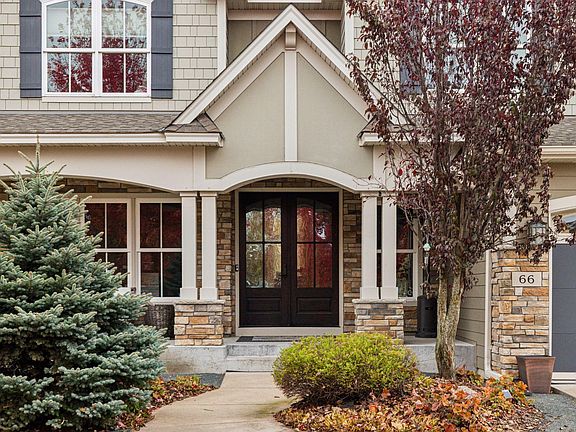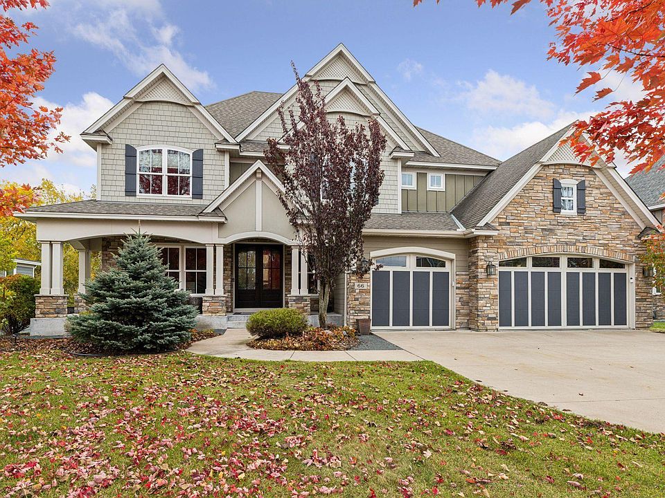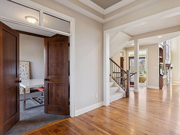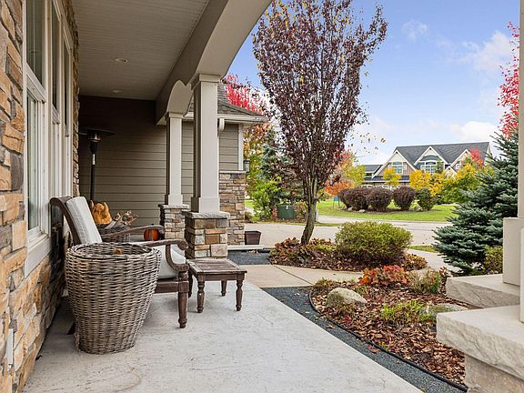 Beautifully finished 2-story home set on a quiet cul-de-sac with a private, fenced backyard overlooking serene nature views. Rich architectural details, wood floors, and sun-filled spaces create a warm, move-in-ready setting. The main level features a grand 2-story Great Room with a full wall of windows and a 2-sided fireplace shared with the inviting Sunroom. The large Kitchen impresses with an enameled island with breakfast bar, walk-in pantry, double wall ovens, and furniture-style cabinetry for the cooktop. Formal and Informal Dining spaces offer flexibility for everyday living and gatherings. A spacious Mud Room provides built-in seating, open locker-style storage, and its own walk-in closet, plus a convenient half Bath. Upstairs, the Primary Suite feels luxurious with a fireplace-accented seating area and an inset ceiling for added definition. The private spa-like Bath includes dual vanities, soaking tub, separate shower, and private water closet plus a large closet with an organized closet system. Bedroom 2 has a full en-suite Bath with tub, while Bedrooms 3 and 4 share a Jack & Jill Bath. The large upper-level Laundry features upper cabinets and open shelving under the counter for easy organization. The walkout lower level adds exceptional versatility - ideal for multi-generational living or effortless entertaining. Highlights include a 5th Bedroom, 3/4 Bath, Wet Bar with fridge & seating, media-ready Family Room, Recreation Room, Flex/Storage Room, and built-in cabinetry. Step out to the expansive Patio or enjoy the newer Deck above. Neighborhood amenities just steps away include an outdoor pool, clubhouse, walking trails, and an outdoor sports court. A welcoming covered front porch completes this exceptional home!