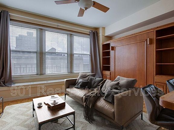 This studio in the desirable Shrine Building is in the middle of all the fun of downtown. The murphy bed easily lifts up and hides away to allow room for living and entertaining. The large windows offer lots of natural light with city overlooks, and there is beautiful parquet wood flooring in the main living space. The kitchen includes all appliances and a butcher block breakfast bar that opens to the living room. Multiple closets and shelving offer storage space. Unit includes several pieces of furniture including a TV. Sorry, no pets.