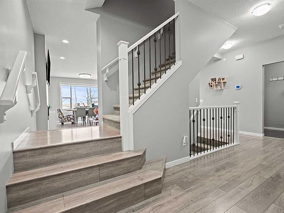 Welcome to this exquisite and fully developed home in the sought-after community of Livingston, offering 3 bedrooms, 3.5 bathrooms, a double attached garage, great back yard with large trees for privacy and over 2,600 sq. ft. of beautifully maintained and thoughtfully upgraded living space. With extensive recent improvements—including brand-new siding and shingles, fresh interior paint, upgraded lighting, central A/C, and a finished garage. From the moment you arrive, the charming curb appeal sets the tone for what awaits inside. Step into a bright, spacious foyer that flows seamlessly into the sun-drenched main floor, designed with both functionality and style in mind. The open-concept layout features gleaming flooring, large dining area, and an expansive living room highlighted by a chic, cozy fireplace that creates the perfect ambiance for everyday living or hosting guests. The gourmet chef’s kitchen is a standout, offering premium stainless steel appliances, quartz countertops, a massive center island ideal for entertaining, abundant cabinetry, a tiled backsplash, and a convenient corner pantry. Whether you’re preparing family meals or gathering with friends, this kitchen delivers exceptional space and comfort. Sliding patio doors lead to the beautifully treed sunny backyard, complete with a large deck and full fencing—perfect for relaxing, barbecuing, or children and pets to play. A well-appointed mudroom off the garage and a stylish 2-piece powder room complete the main level. Upstairs, you’ll find an impressive bonus/family room that provides an additional living space for movie nights, a play area, or a home office. The thoughtfully designed upper level also includes, a full 4-piece bathroom, and a spacious laundry room for added convenience. The luxurious primary suite serves as your private retreat, offering a walk-in closet and a spa-inspired 4-piece ensuite with modern finishes. The fully developed basement adds even more value with a large recreation room, a 3-piece bathroom, ample storage, and flexibility for future customization—whether you envision a home gym, hobby room, or additional guest space. Outside, the double attached garage is fully finished, and the driveway provides room for additional parking. The landscaped yard offers both beauty and privacy, making it an ideal space for outdoor enjoyment. Located in the vibrant community of Livingston—with access to the popular Community Hub, Splash Park, playgrounds, parks, green spaces, walking / bike paths, and excellent amenities—this home provides exceptional convenience with quick access to major roadways, shopping, restaurants, and public transportation. This stunning, move-in-ready property truly has it all—style, space, upgrades, location, and comfort. A must-see opportunity you won’t want to miss!