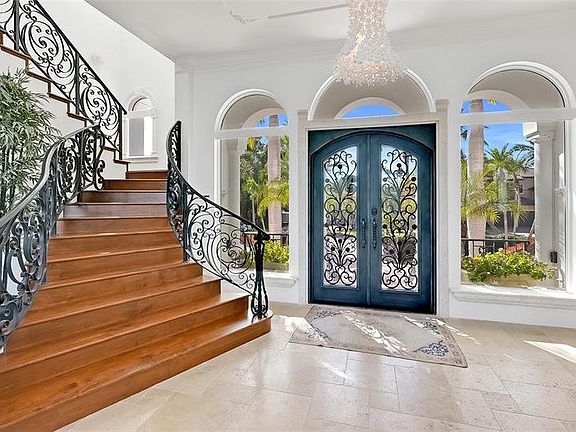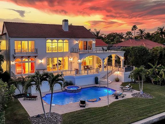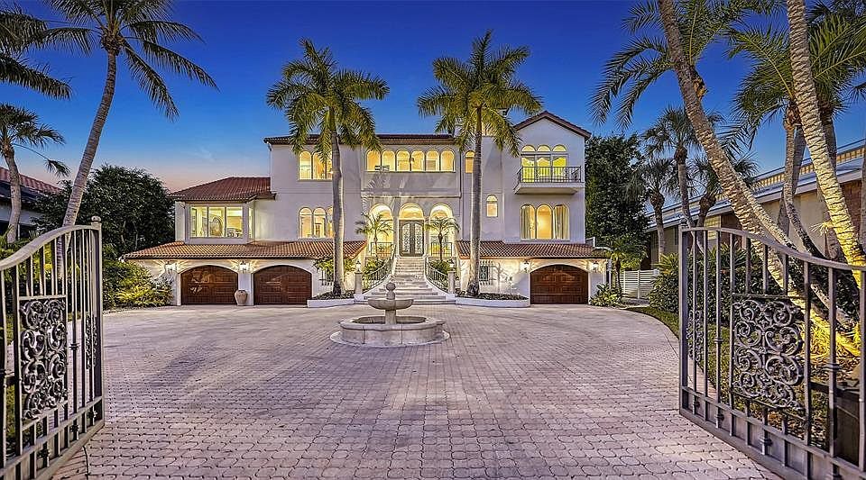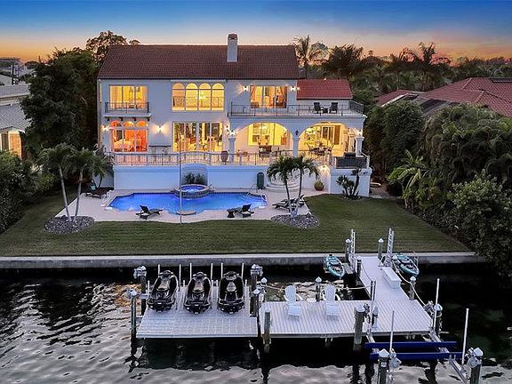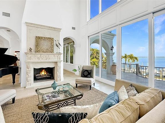 Privately situated in John Ringling Estates on an extraordinary bayfront location with close proximity to St. Armands Circle, this masterfully crafted estate presents expansive views of the Ringling Bridge and cityscape. 113 feet of captivating waterfront is viewable from most rooms while worldly influences and illustrious finishes accentuate the customized 5,000 SF home. Entering a circular driveway centered by an enchanting fountain, the two-story residence stands like a fortress for lavish comforts and an incredible coastal lifestyle. Superb vistas are displayed through double sets of glass sliders and two-story-high picture windows the moment you enter the glass and wrought iron double doors. A beautifully curated wood and wrought iron staircase draw your gaze to the second floor and breathtakingly high ceilings, while a carved stone gas fireplace anchors the living room. Flowing effortlessly to the formal dining room, a modern-style wet bar with a wine refrigeration enhances the space and transitions to the contemporary kitchen boasting Miele appliances, built-in coffee maker, chic cabinetry, Silestone countertops and two islands. Disappearing sliders open the eat-in kitchen to the terrace for dining alfresco above the pool and bay. On the opposite wing, just off the living room, you find a den directly across from a guest suite featuring sliders that open to the balcony and a high-end en-suite bath. Take the stairs or elevator to the second level to locate two more generously sized bedrooms that share a Jack-and-Jill bath and one room opens to a private terrace facing the water. Across the landing graced with more wrought iron railing, you discover the master suite encompassing its own wing for ultimate privacy, featuring a partial wraparound balcony, sitting area, built-ins, two walk-in closets with custom built-ins, and double doors leading to the en-suite bath featuring dual vanities, and a walk-in shower. The outdoor space boasts a welcoming resort styled terrace that extends the living space from inside and stairs that lead to the pool and fenced backyard on the water's edge, hosting mature fruiting foliage and landscaping. For the ultimate island-style experience, the recently upgraded dock features lifts for kayaks, a large vessel, (14,000 lb lift) and up to three jet skis. Adding to the notable list of amenities found in this home are the wine room, ample storage and flex space for versatility, could be a fitness room, media room or craft room/workshop, complete high-tech security system throughout and 2 tandem-parking garages and one single for up to 5 vehicles, motorbikes, and toys for the water. Stroll to St. Armands Circle to experience the eclectic shops and restaurants, walk or bicycle to Lido Beach, and take a quick venture to downtown Sarasota to experience the cultural attractions and nightlife in the city. Don't forget to take the virtual tour!