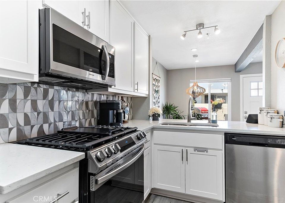 Extensively upgraded from floor to ceiling and wall to wall! No detail was spared. Adorable private corner unit with no one above or below. As you enter from your private deck you step into a bright, modern open floor plan with beamed ceiling. The updated windows and slider allow natural light to fill the home. All windows have newer custom window treatments with both bedrooms having a blackout shade option for your sleeping comfort. The beautiful newer tiled flooring, crown molding and light fixtures flow throughout the home. The kitchen has been upgraded with all newer shaker cabinets, quartz countertops, beautiful backsplash, stainless steel appliances, smart Samsung Fridge, smart front control Samsung gas range that is fully Wi-Fi connected, voice enabled, Air Fry mode, quick boil option, griddle and so much more, making it easy to create delicious and healthier meals for you & your family faster. Bathroom has been reimagined with 2 double sinks, newer bidet toilet, newer tub, fresh tile, newer vanity, newer mirrors and lighting! Spacious bedrooms with newer fans, full sized closet and custom walk-in closet in Primary with a shoe rack holding up to 54 pairs of shoes! Separate large laundry room with washer & dryer hookups (both electric & gas option for the dryer) and storage cabinets. Beautiful sunsets views from the bedrooms as well as Angel Stadium & Downtown Disney Fireworks. Not only does this home have fresh paint, upgraded electrical panel, new sub-flooring and been completely upgraded, it lies within the desirable Walnut Square. This community has tons of amenities, excellent location in the heart of Irvine and is ready for you!