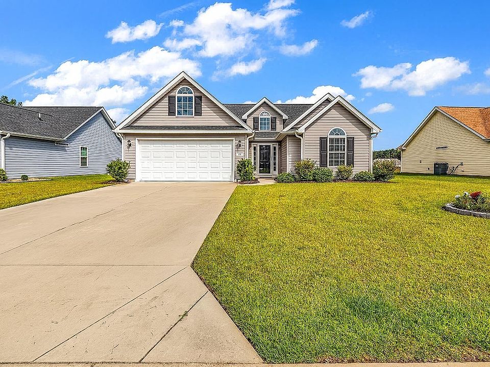 Beautiful Archway floor plan by Flagship Construction features a single level home with 3 Bedrooms, two bathrooms, screened porch, and a two-car garage in The Village at Palmetto Greens in Longs, SC. Home is immucalate, light and bright with beautiful, soothing colors and custom light fixtures/faucets. Low maintenance luxury vinyl flooring throughout and NO carpet. New HVAC unit in 2025 and a smart, programmable thermostat to ensure energy efficiency. Desirable open concept living area features soaring 13 foot vaulted ceilings and a transom window above the front door, so room feels much larger - very bright and spacious. Beautiful white cabinetry in kitchen, granite countertops, a new garbage disposal, pantry, and Frigidaire stainless steel appliances, including the French door refrigerator. Breakfast bar and bay window in the breakfast nook adds additional lighting/openness. Primary bedroom is very relaxing- features a tray ceiling and a spacious walk-in closet. Primary bathroom is light and bright with a transom window over the shower, corner seat in shower, granite countertop vanity, linen closet, and a knee wall providing separation from the toilet. Desirable split level floor plan gives everyone privacy. Second bedroom has vaulted ceilings for a spacious feel. The second bathroom features a transom window, granite countertop, and shower with a corner seat. Ceiling fans are in ALL bedrooms and the living room. Screened porch is perfect for relaxing or entertaining outdoors. Patio provides a space for grilling or relaxing in the Carolina sunshine. Cathedral style interior doors, neutral luxury vinyl flooring, white cabinetry, granite and sleek faucets throughout the home - every detail was thoughtfully selected. Floor plan was customized to have the washer and dryer inside - just off the garage entrance- with hanging space for laundry along with a storage closet and even a door to close off laundry room from the living area. Washer and dryer both convey. Irrigation system to keep lawn beautiful all year long; gutters were also installed. Pull-down attic space above garage for storing holiday items. Low Homeowner's dues here include trash pick up. You are only minutes to shopping, restuarants, grocery stores, thrift stores, golf courses, and McCleod Hospital. Home may also be sold Partially furnished - ask your agent. This home is a Must See - One owner and better than new- you won't need to do one thing! Open House on Sat. Oct 11th from 12-2 PM.