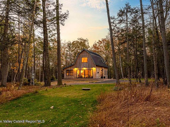 So close yet so far away! Walk to town from your totally private and like-new timber frame home with soaring 23-foot ceilings and walls of windows to bring nature in. As you enter from one of Woodstock's most coveted roads, through the stately pillars, you will feel a sense of tranquility with nature on this 9.94-acre lot that is just a half mile from the village of Woodstock and less than a half mile from the iconic Levon Helm barn. As you follow the curve of the driveway and the glacial bluestone outcropping deposits rising from the meadow, this elegantly sited Harvest Moon timber frame home blends seamlessly with the trees with its black metal roof and natural wood siding. Through the old timber you can even see peeks of Overlook Mountain that could be expanded. Experience elevated eco-conscious living in this architecturally stunning timber frame home, built in 2021 with sustainability and style at its core. This 2-bedroom, 2-bath residence showcases soaring ceilings, exposed timber framing, and an open-flow layout that celebrates natural light and craftsmanship.