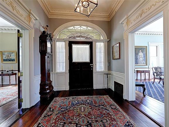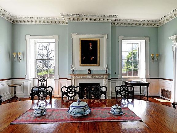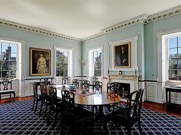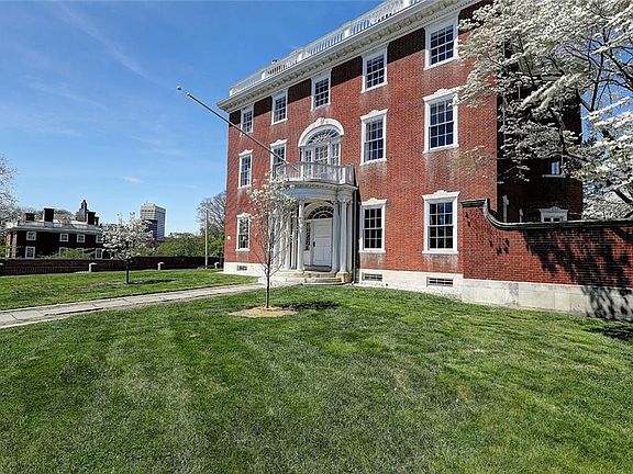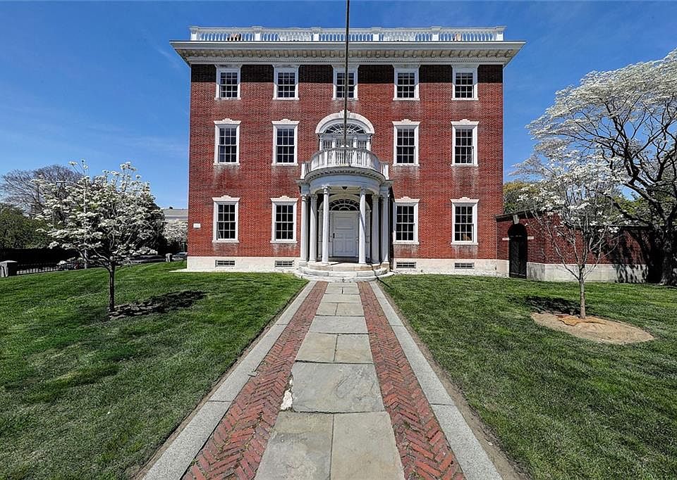 The Thomas Poynton Ives House, c1803, is one of the most exquisite examples of the Early Republican period of architecture in Providence. Set on two acres, this three-story, brick structure was built by Caleb Ormsbee, a master builder. The home is an enduring monument to Adamesque-Federal style. Take in the city skyline as you approach the circular porch with Ionic columns, leading to the main doorway flanked by sidelight windows and topped by an elliptical fanlight. Step into the center hall, where Adamesque woodwork leads to main staircase, which spirals upward in a unique flourish. On the left is the fireplaced, dining room connected to a butler’s pantry and kitchen. Return to the center hall and into the drawing room with elaborate plaster molding gently lit by the room’s original crystal candelabrum and handsome fireplace. The adjacent library was renovated in the 1870s, when an oval west wall was added and the room was finished in black walnut. Multiple sets of French doors step out to the stunning rear terrace and grounds. Upstairs on the second floor is the fireplaced owner’s suite featuring an ensuite bath and an adjacent sitting room. A second, bedroom suite also enjoys a private full bath, while three more bedrooms, two sharing access to a full bath, continue the pleasing style. The third level offers additional living quarters. Across the cobblestone motor court is the carriage house with all its period detail lovingly preserved. Own a piece of American History.