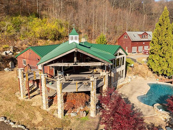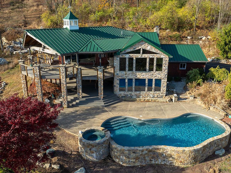 Elevated “Colorado Contemporary” Chalet with Endless Views Perched above the treetops, this stunning stone-and-wood contemporary blends rustic design with modern comforts — offering dramatic architecture and thoughtfully designed outdoor spaces that feel straight out of the Rockies. A home worthy of previous architectural magazine covers, your outdoor living is as elevated as the soaring views you take in from every angle. The two-tier deck is crowned by a cathedral ceiling with wood beams, accent lighting, cupola, and a floor-to-ceiling stone gas fireplace — perfect for year-round enjoyment. Step down to the expansive lower patio, beautifully landscaped and anchored by an in-ground pool and hot tub, stone retaining wall, and a cozy viewing deck ideal for morning coffee or evening stargazing. The main entry sets the tone immediately, where slate floors and a striking stone accent wall welcome you with the rustic elegance of a mountain lodge. Head upstairs to the heart of the home to find an open-concept main living space designed to showcase panoramic views and natural textures at every turn. You’re greeted by a dramatic floor-to-ceiling stone, wood-burning fireplace in the living room and by soaring cathedral ceilings with wood beams with thoughtfully placed eyeball lighting for evening ambiance. The chef’s kitchen is both functional and stylish — boasting granite countertops, a large center island with breakfast bar and built-in range, newer cabinetry, stainless steel appliances, a double sink, stone accent wall, and walk-in pantry. The grand open concept allows for cooking, dining, and entertaining for gatherings of any size. That includes an awesome dining room, where a wood ceiling and cathedral wood ceiling with fan and eyeball lighting create a warm, rustic ambience, while a full wall of windows and double glass doors to the upper level deck illuminate the space with natural light and unbeatable views. The breathtaking views continue in the Master Suite, where a massive window and double glass sliders open to the second-story deck, as well as plush carpeting, dual closets, and a private ensuite bath with a tub/shower combo. Two large additional bedrooms — one with a walk-in closet and its own slider to the back deck and patio — offer room for the kids, visiting family, or your personal office space. A lower-level full bath with a tiled stall shower and oversized vanity, as well as a dedicated laundry room add smart functionality to everyday living. The attached 2-car garage with 42" side access to the fenced backyard is great for everyday storage, while a separate 4-bay detached garage with 10-ft doors and upper-level storage offers incredible flexibility — ideal for car enthusiasts, workshop space, a future office, or potential guest apartment with both interior and exterior stairs. Recent mechanical upgrades include a newer metal roof, hot water heater, and high-efficiency geothermal heat pump—bringing peace of mind and long-term savings.
