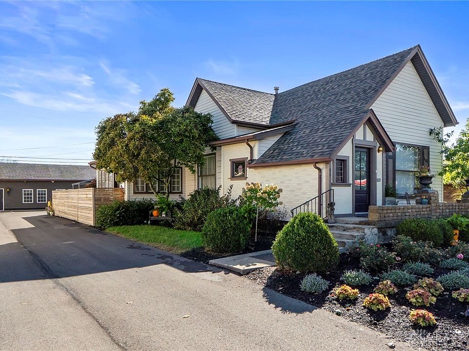 Experience timeless elegance and modern versatility in this beautifully updated Tudor-style home offering 1,939 square feet of living space, three bedrooms, two full bathrooms, and one half bathroom, plus a partial basement. From the moment you arrive, the home’s storybook architecture captures attention with its steep rooflines, decorative trim, and manicured landscaping framed by blooming shrubs and mature greenery. Inside, historic character meets contemporary design through arched entries, crown molding, and warm hardwood flooring. The kitchen is a true centerpiece—featuring rich cabinetry with brass hardware, open shelving, dark granite countertops, a farmhouse sink, and a striking two-tone ceiling accent that adds warmth and dimension. Each bathroom has been meticulously updated, blending vintage charm with today’s modern style. The main-level bath showcases black-and-white patterned tile, elegant botanical wallpaper, gold fixtures, and a glass-enclosed walk-in shower with subway tile. Every detail exudes refinement and craftsmanship. The partially finished basement provides a one-of-a-kind retreat, designed with custom trim work, warm lighting, and decorative plaster details. This inviting space features a stone accent wall with an artistic centerpiece, built-in shelving, and plenty of room for lounging or entertaining—offering the perfect atmosphere for a home theater, wine lounge, or creative studio. A standout feature of this property is the 800-square-foot finished garage-like space—perfect for a home business, salon, studio, or golf simulator setup. This flexible area offers unparalleled adaptability for both personal and professional use. With its ideal blend of architectural charm and modern function, this Tudor is a rare opportunity to own a home that’s as distinctive as it is practical—ready to accommodate both lifestyle and creativity.