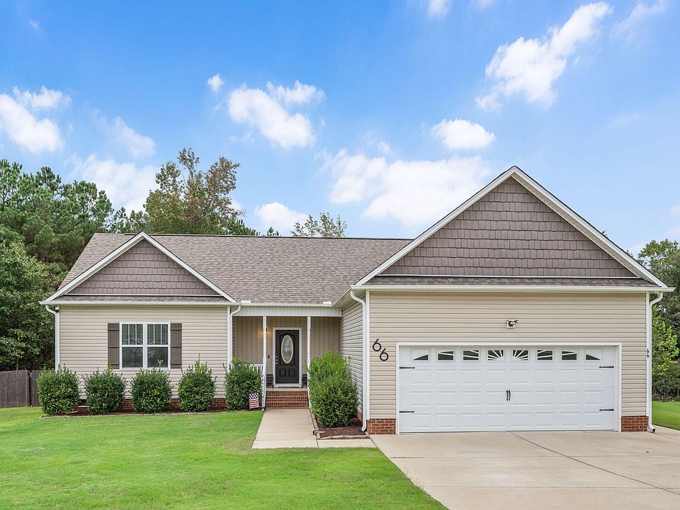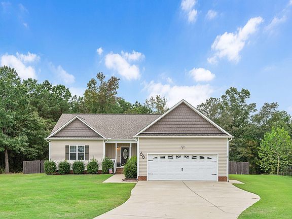 Charming home on a spacious 0.65-acre cul-de-sac lot backing to nature! Enjoy an open floorplan filled with natural light, high ceilings, and a spacious family room with vaulted ceilings and cozy gas log fireplace. The kitchen offers an eat-in bar, separate breakfast area, and flows seamlessly into the main living space. The split-bedroom layout provides privacy, with a large primary suite featuring a trey ceiling, walk-in closet, and a luxurious bath with dual vanity, garden tub, and separate shower. Spacious secondary bedrooms with large closets. Additional highlights include a 2-car garage, low-maintenance vinyl siding, and upgraded bathroom mirrors, plumbing fixtures, lighting, and ceiling fans in all bedrooms. Step outside to a large deck overlooking the peaceful, fenced, wooded backyard - ideal for relaxing or hosting. Conveniently located just minutes from downtown Four Oaks and Interstates 40 & 95. Move-in Ready!