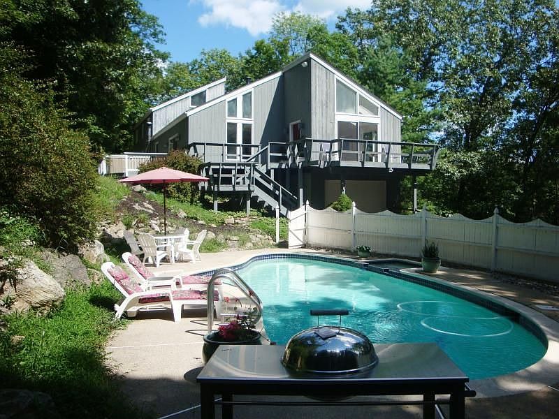 Under Contract! Screened by Nature, 2 Acres of property. Open Floor Plan. LR w/Wood Burning Stove, Vaulted Ceilings, Skylights, Family/Game Room w/Slider to Deck. 4 Br's, Loft, Office, Lower Level w/Exercise Room, 2 Car Garage. Enjoy the In-Ground Swimming Pool, C/A.