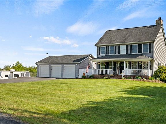 Hunters Ridge...This new to you homeplace is move in ready! Nestled on just a little over 5 acres, this home checks all the boxes, including the wildlife enthusiasts. The back deck and kitchen windows provide peaceful pastoral, mountain ridge and tree lined views. This is a great space to entertain and in the summers you can enjoy the above ground saltwater pool. The interior of the home provides three bedrooms and two full baths on the second level. The main level features an updated kitchen, which is open to the dining and living areas, a wood burning fireplace and a half bath. Enjoy a large recreational/flexible finished room in the basement with custom built in's and Rice coal stove heating (as well as electric baseboard for your preference). Plenty of storage throughout, so everything can have it's own place. From the inside to the outside, there is plenty of space to spread out. Enjoy working on cars, workshopping, woodworking? Then you will relish in your escape to the two story, three car detached garage. Located just off of Bald Rock Rd in Verona and in Fort Defiance School Districts, this property has all you've been searching for. Seller offering a 1 year home warranty.