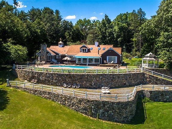 This spectacular country estate tucked away behind stately gates affords dramatic views and the serene comfort of your own private retreat. This home is perched upon 24 glorious acres overlooking a beautifully designed in-ground pool, two-spring fed ponds & lush rolling hills providing activities such as swimming, fishing,canoeing,hiking,horseback riding & entertaining. This sprawling one level floor plan w/separate bedrooms wings allows for today's living lifestyles. The eat-in kitchen has been renovated top to bottom featuring granite counter tops, Viking appliances, Sub-Zero fridge, pot filler, floor to ceiling fieldstone fireplace and radiant-heated Italian tiled floors.Entertaining in the spacious living rm w/fireplace flowing to sunroom flanked by windows bringing the outside in. Off the kitchen enjoy a meal & views in formal dining rm. Continue to the vaulted ceiling family rm w/floor to ceiling fireplace & staircase to loft/office. The ensuite master w/fireplace, sliders to deck & spa bath offers a tranquil setting. Add't main fl bedrooms are smartly located on both sides of house & a 2nd floor bedrm & playrm.This home is designed for large & small gatherings, generational living,overnight guests & especially the folks w/love of the great outdoors! Property features 2 barns for horses/storage, outdoor gazebo, stone terraces, iron entry gates. It's a magical place for relaxing whether it's all year round or weekends. Unlimited possibilities await!