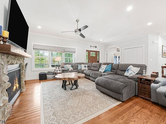 Set back on a 2.42-acre lot, meticulously designed, home offers luxury, space & functionality at every turn. Featuring an impressive 3-car garage w/ soaring 16 ft ceilings, this property is perfect for car enthusiasts or those seeking extra storage. Step inside to find beautiful hardwood floors throughout & an open-concept layout centered around a gas stone fireplace in the main family room. A spacious office or additional living area provides flexibility for your lifestyle needs. Heart of the home is the gourmet eat-in kitchen, complete w/ a large granite center island w/ seating for 6, SS appliances, 3 refrigerators, walk-in pantry, gas-burning stove w/ custom hood & rich custom cabinetry, perfect for entertaining or everyday living. A main fl primary suite is a true retreat, featuring a custom walk-in closet & spa-like bath w/ a walk-in shower, soaking tub & dual vanities. A powder room, laundry area & access to the outdoor deck complete the main level. Upstairs, you'll find a 2nd family room, 3 generously sized bedrooms & a full bath, offering plenty of space for everyone. Step outside to your own private oasis a huge deck off the kitchen leads to a beautifully landscaped yard w/ a paver walkway & a pristine in-ground pool. Whether hosting gatherings or enjoying a quiet evening outdoors, this home offers the perfect blend of luxury & comfort in a serene, spacious setting.