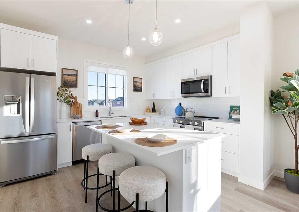Welcome to 66 Creekside Way SW—where thoughtful design, flexible living space, and high-quality finishes come together in this fully developed 4-bedroom, 3.5-bathroom townhome. With over 1,600 sqft of living space including a professionally finished basement, this home offers room to grow, relax, and live with ease—all in one of Calgary’s newest and most connected south communities. Step inside and immediately feel the warmth of a home that’s been upgraded for everyday comfort and elevated living. The open-concept layout flows effortlessly across the main level, where 9’ knockdown ceilings, contemporary lighting, and stylish finishes create a fresh, modern feel. Durable luxury vinyl plank flooring spans both the lower and main floors, offering practicality and style, while soft warm grey carpeting with plush 8lb underlay adds comfort in the upstairs hallway and bedrooms. The kitchen blends form and function with slab-style cabinetry extended to 42” uppers, soft-close drawers and doors, a designer tile backsplash, and gleaming quartz countertops. Stainless steel appliances complete the clean, modern look, while the thoughtful layout offers plenty of prep space and storage. A bright dining area and spacious living room invite gathering and connection, whether you're hosting or enjoying a quiet night in. Upstairs, you'll find three well-appointed bedrooms, including a serene primary suite with a private ensuite featuring quartz counters, tiled backsplash, chrome fixtures, and a high-efficiency toilet. A full second bathroom and convenient stacked laundry complete the upper level, adding practicality without sacrificing space. The fully finished basement extends the home’s versatility, offering a fourth bedroom, a third full bathroom, and a spacious rec area—ideal for guests, a home office, or additional living space to suit your lifestyle. A single attached garage and an additional surface parking stall ensure that there’s always room for both vehicles and storage. Enjoy warm summer evenings or quiet mornings on your private front patio, while the community’s network of pathways, parks, and green space encourage an active, outdoor lifestyle. Sirocco offers unbeatable access to major routes like McLeod Trail, as well as nearby shopping in Shawnessy, Walden, and Legacy. Golfers will love being just minutes from Sirocco Golf Club, and equestrian fans are a short drive from Spruce Meadows. Whether you're commuting, shopping, or looking to unwind, this location keeps you close to it all. Stylish, functional, and move-in ready, this townhome offers the space and upgrades you want in a setting that feels like home. Welcome to 66 Creekside Way SW—where community, comfort, and convenience meet.