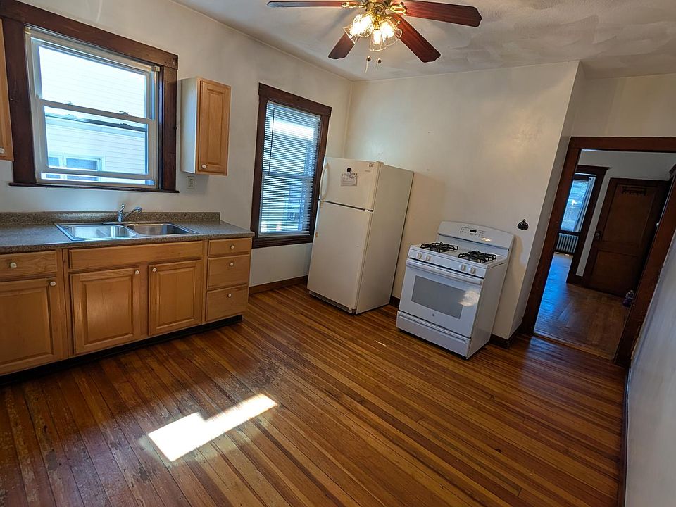 1st floor unit, eat-in kitchen, refrigerator, hardwood floor(s), washer and dryer, dining room, living room, back deck, yard, storage, gas heat (tenant pays), gas hot water (tenant pays), electricity (tenant pays), street parking, small pets