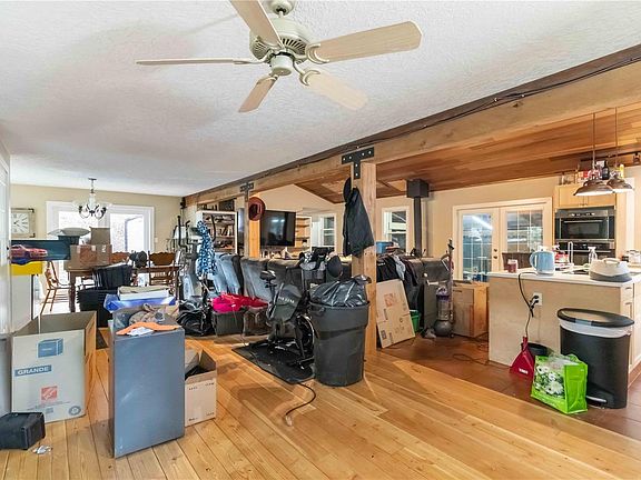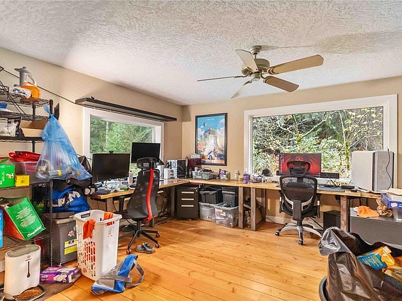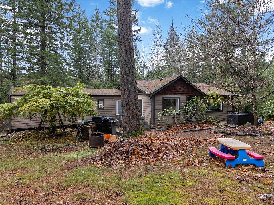 Discover this charming 1.24-acre property in the Highlands—just 10 minutes from Costco and Millstream Market. Originally a 1989 manufactured home, it was beautifully converted in the early 2000s into a spacious 3-bedroom plus den rancher. Enjoy an open, modern layout featuring a large kitchen with quartz counters, a bright family room, a living room with vaulted ceilings and cozy woodstove, and a separate dining area. The primary bedroom includes a 2-piece ensuite, with two additional bedrooms, a den/office (potential 4th bedroom), and laundry area. Highlights include laminate floors, Hardie board siding, and a heat pump (requires servicing). Outside, relax on the private patio surrounded by a park-like setting with level lawns, gardens, a stream, trails, and a treehouse. Detached workshop, storage building, and ample parking with RV space. New well pressure tank. A peaceful family-friendly property—perfect for kids and pets. Some notice required for showings, as it is tenanted.