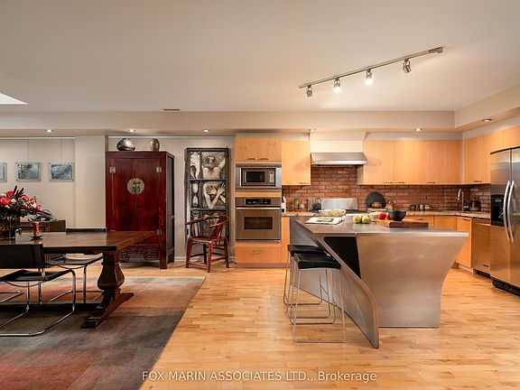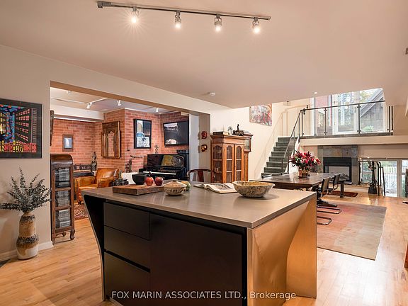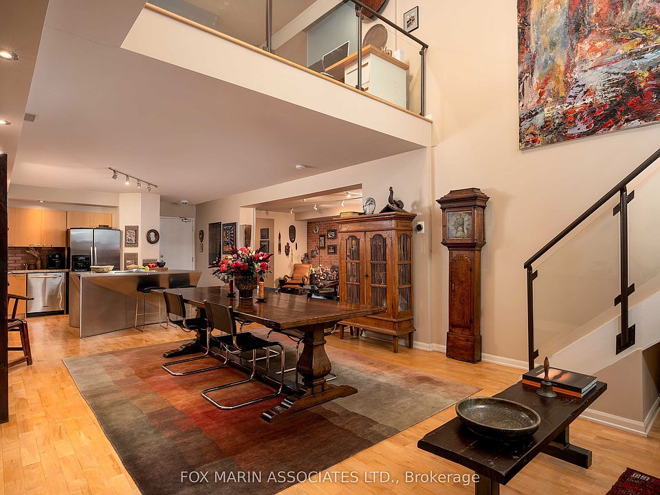 In a city filled with repetition, Loft 112 stands quietly apart. There's no question that there's nothing quite like it. Full stop. Once the Riverdale Presbyterian Church, this remarkable 2004 Bob Mitchell conversion remains a study in adaptive reuse & timeless artistry. Inside, texture tells the story: exposed brick walls, sculptural staircases, warm hardwood flooring & stainless-steel accents anchor its generous rooms & cozy alcoves. Sunlight washes through floor-to-ceiling windows from the upper & lower outdoor spaces, catching the patina of vintage woods, curated bookshelves & collected art throughout. Spanning 2,250+ sq. ft. inside & another 492 sq. ft. outdoors, this multi-level residence unfolds with intention. The open kitchen, outfitted with marble counters, a geometric island & bar seating for two, flows into a dramatic dining area framed by 17 ft ceilings, exposed brick walls & soft track lighting, while a dual-sided gas fireplace hums with quiet elegance. Upstairs, the 800+ sq. ft. primary suite feels like a private atelier with a 4- pc ensuite, walk-in closet, open-air office & stunning east-facing terrace walk-out. Each level reveals new layers of design & purpose, balancing grandeur with function. The main floor's 2nd bedroom, enclosed by sliding doors with a 3-pc ensuite & laundry nearby, offers flexibility for guests, creative pursuits or a private screening room. A bonus living area provides a versatile extension of the home's main space, ideal for relaxing, entertaining or creating a dedicated media or listening lounge. Below grade, an unexpected brick-walled wine cellar provides an atmospheric retreat, easily reimagined as a reading room or home gym. As the largest suite in the building, bar none & unseen on the market since 2006, Loft 112 remains a singular expression of Toronto's architectural evolution. In this residence, history, art & modern life move in effortless cadence, impossible to replicate (& never to duplicate).