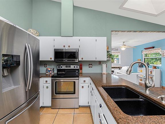 Less than 3 miles to Englewood Beach – what a fantastic location! This charming 2-bedroom + den, 2-bathroom home is situated in the desirable X flood zone and features impact-rated windows, doors, and a garage door for added peace of mind. Set on a spacious lot with mature landscaping, this home offers both privacy and curb appeal with its inviting front porch and brick accents. Inside, tile flooring throughout makes maintenance a breeze. The great room has a vaulted ceiling and a large bay window, creating a bright and airy feel. The kitchen and dining areas are enhanced by vaulted ceilings with skylights, flooding the space with natural light. Stainless steel appliances, granite countertops, a pantry with built-in storage, and double French doors complete the kitchen and dining area. The adjacent den, currently used as a craft and hobby room, offers endless possibilities to suit your needs. The primary suite features a walk-in closet and an ensuite bathroom with a fully tiled step-in shower and a stylish barn-door-style vanity with a quartz countertop. A comfortable guest bedroom and bathroom provide a welcoming space for visitors. The screened-in lanai with a ceiling fan is the perfect spot to relax, enjoy outdoor dining, or unwind with a good book. Located in the heart of Englewood, this home is close to local restaurants, shopping, golf courses, walking and biking trails, and the weekly farmers market on historic Dearborn Street. Don’t miss this opportunity—schedule your showing today!