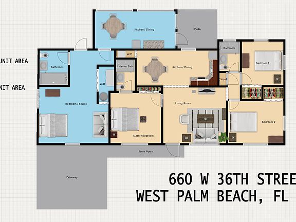 Experience the best of South Florida living with this incredible investment or multi-generational home opportunity in vibrant West Palm Beach! Nestled less than five minutes from the iconic Singer Island beaches, Lake Park Marina, and Peanut Island, this property offers unbeatable convenience for outdoor enthusiasts and beach lovers alike. Featuring a total of 1,603 square feet, this property boasts two fully equipped units: a spacious 3-bedroom, 2-bathroom main house, and a private 1-bedroom, 1-bathroom rear unit with its own separate entrance, full kitchen, and washer/dryer--currently generating $1,600 per month in rental income. The home is outfitted with solar panels (100% paid off) for energy efficiency and sits on nearly a quarter-acre with a large backyard perfect for adding a pool or designing an outdoor oasis. Schedule your tour today to explore this unique property and make it yours!