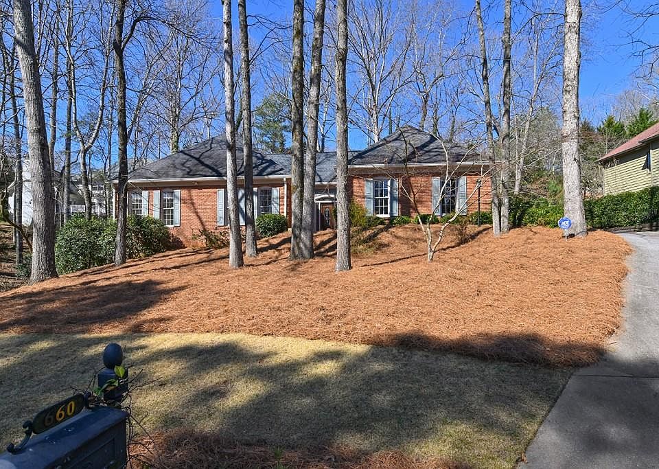 Beautiful, well maintained brick ranch offers one level living at its best. Located in golf course/country club community on the Chattahoochee River and only 2 miles from GA 400. Fresh paint on the exterior of this 3 sides brick home. Welcoming entry ushers you into this bright and sunny, large Great Room with high ceilings & brick fireplace. It opens onto the large deck and screen porch that extends across the entire back of the house. Hardwood floors in the great room and dining room. The spacious master suite has 2 closets and a french door leading to the deck. Master bath has double sinks, garden tub and separate shower ideal layout to make it your own with new finishes. Two nice sized secondary bedrooms on the main level with a pristine Jack & Jill bath between. Newer stainless steel oven, refrigerator and microwave/convection in the kitchen with casual dining area and garden window. Back hall currently functions as a butlers pantry/coffee bar, with 2 pantries and laundry hook-up behind doors. Finished lower level includes a 2nd fireplace in living area with sliding glass door leading to walk out patio, private 4th bedroom and full bathroom. Lots of storage space in the clean & neat unfinished area. Pretty back yard is level. Dont miss the scenic walk to the backyard from the garage. Horseshoe Bend is an established community of 1200 homes with walking paths, the Tom Harris Meadow and two lakes with gazebos and docks.