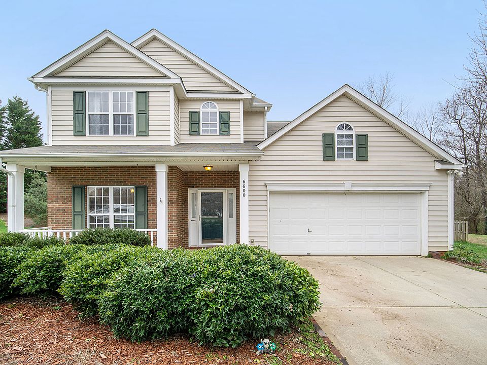 Large 1/3 acre cul-de-sac lot with wide, fenced backyard; plenty of room to enjoy the Carolina sunshine. Low maintenance vinyl & brick exterior & covered rocking chair front porch. Fresh, neutral interior paint & brand new carpet completed just prior to listing; ready for new owner! Laminate wood floors throughout main level & updated light fixtures in several rooms. Open layout with great natural light. Huge eat-in kitchen with 42" cabinetry, tile backsplash, & stainless appliances. Spacious master bedroom feels even larger with vaulted ceilings. Dual master vanity sinks, garden tub, & walk-in closet. Fourth bedroom is setup perfectly to be media, playroom, or office. Backyard patio & newly refinished deck perfect for outdoor entertaining. Bradfield Farms enjoys low county-only taxes & has multiple pools, pond, playgrounds, tennis courts, & more! Less than 5 minutes to I-485; easy to get anywhere in Charlotte.