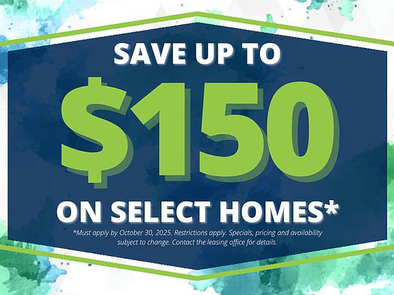 - Special offer! Save up to $150 off select apartment homes! *Must apply by October 30, 2025. Restrictions apply. Specials, pricing and availability subject to change. Contact the leasing office for details.