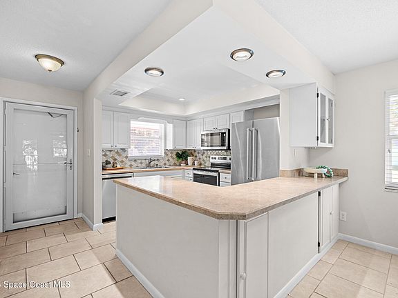 End unit in Cape Shores with natural light throughout, impact windows, and a calm view of the Banana River from the screened balcony. The layout feels open and comfortable, with two bedrooms, two baths, and a main living area that connects easily to the kitchen. Built-ins add extra storage and make good use of the space. The community laundry room is just a few steps away and includes your own storage cage for convenience. Cape Shores offers everything you want in a coastal community. A private boat ramp and dock, heated pool, fitness room, clubhouse, sauna, and more. Tucked between the river and the ocean, it sits minutes from Port Canaveral, Cocoa Beach, and local restaurants along A1A. A peaceful place to live full time or keep as a low-maintenance getaway near the water.