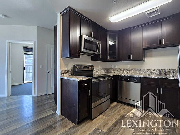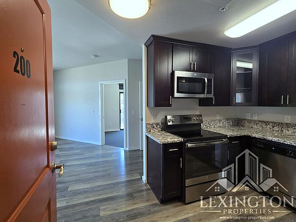 Clean finishesNatural lightStainless-steel appliancesGranite countertopsDark cabinetryAmple closet spaceStylish kitchen