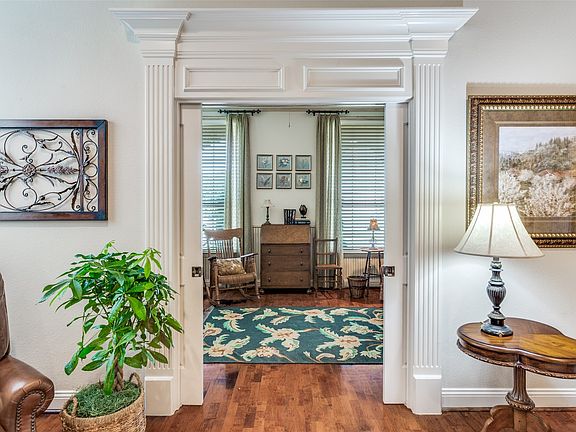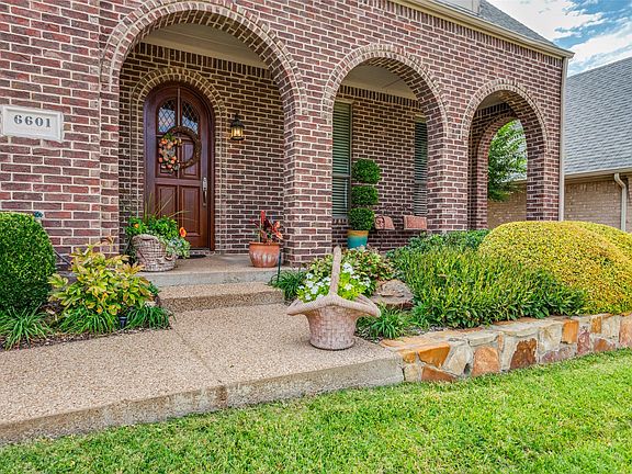 Welcome to this stunning former model home by builder Rick Sheddy, located in the gated community of Ridgmar Estates. Set on a desirable corner lot with a side-entry garage, this home offers instant curb appeal with its striking brick arches, charming covered front patio and solid wood front door featuring etched glass details. Step inside to discover rich wood floors throughout the main level and staircase, complemented by exquisite custom millwork—including a spindled staircase, detailed crown molding, wood-cased pocket doors and windows, carved vanities, and beautifully framed architectural features. The kitchen is a dream for entertainers, equipped with a gas cooktop, large island with built-in storage, walk-in pantry, and a cozy seating area nestled beside a double-sided gas fireplace. A window above the sink and thoughtful layout create a warm and inviting atmosphere, ideal for gathering with friends and family. Enjoy the ambiance of the double-sided fireplace from the kitchen, dining, and living area. A glass door leads to a covered back patio and beautifully landscaped backyard oasis, complete with turf and a sparkling saltwater pool—perfect for outdoor entertaining.