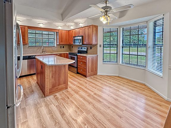 Discover the perfect family home, nestled in a peaceful and picturesque setting in the Lakewood Park community. This beautiful 3-bedroom, 3-bathroom single-family residence, situated on a spacious .29-acre corner lot, is surrounded by mature trees and boasts a charming brick exterior w/brand new roof. Ample parking with a side entry garage and expanded driveway for add'l boat/RV parking.Inside, you'll find a remodeled kitchen complete with wood cabinets, granite countertops, and stainless-steel appliances. Enjoy the breakfast area with a view and the convenient pass thru design allows entertaining in the formal dining space a breeze. The large living room, featuring a cathedral ceiling with tongue and groove wood and a cozy fireplace, offers the ideal spot to unwind and entertain. The versatile bonus room can be tailored to your needs, serving as a family room, game room, or home office. Bask in the Florida sunshine on the large enclosed back porch or relax on the cozy covered front porch, where you can enjoy beautiful lake views. Additional features of this delightful home include multiple skylights, adding natural sunlight, tile and laminate flooring, a tankless hot water system, and a large storage shed with power.