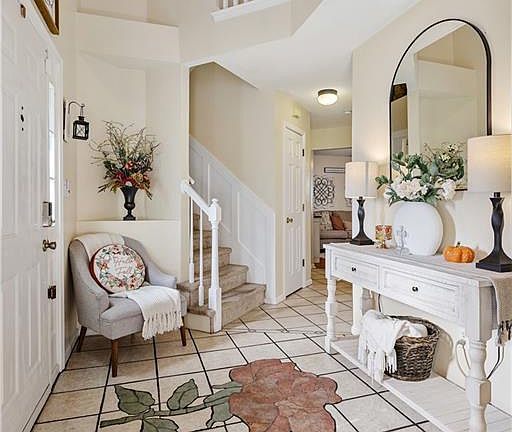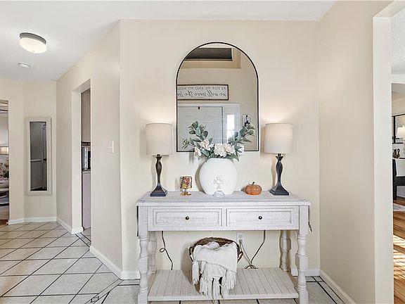 This home is truly one-of-a-kind! When you enter this 4 bedroom, 2.5 bathroom home, you'll be greeted with a beautiful, custom rose designed into the tile floors. You'll walk through a spacious office, a formal dining room with water views, a breakfast nook and a spacious kitchen with a built-in desk. Next, you'll enter the family room with a marble fireplace and bar overlooking the kitchen. Upstairs, you'll discover that the 4th bedroom has its own private staircase! The owner's suite has a jetted tub, a separate shower, double-sinks, a built-in vanity and TWO walk-in-closets - one closet is the size of an entire bedroom with custom shelving! The HUGE new patio has water views and is an entertainer's dream! There's a brand new covered pergola and a custom wooden trellis. Kitchen appliances updated (2024). Washer/Dryer (2024). New chandelier & electric window shade w/ remote. New garage doors & storm door! Community clubhouse, pool, parks, trails & tennis court! Tour today!