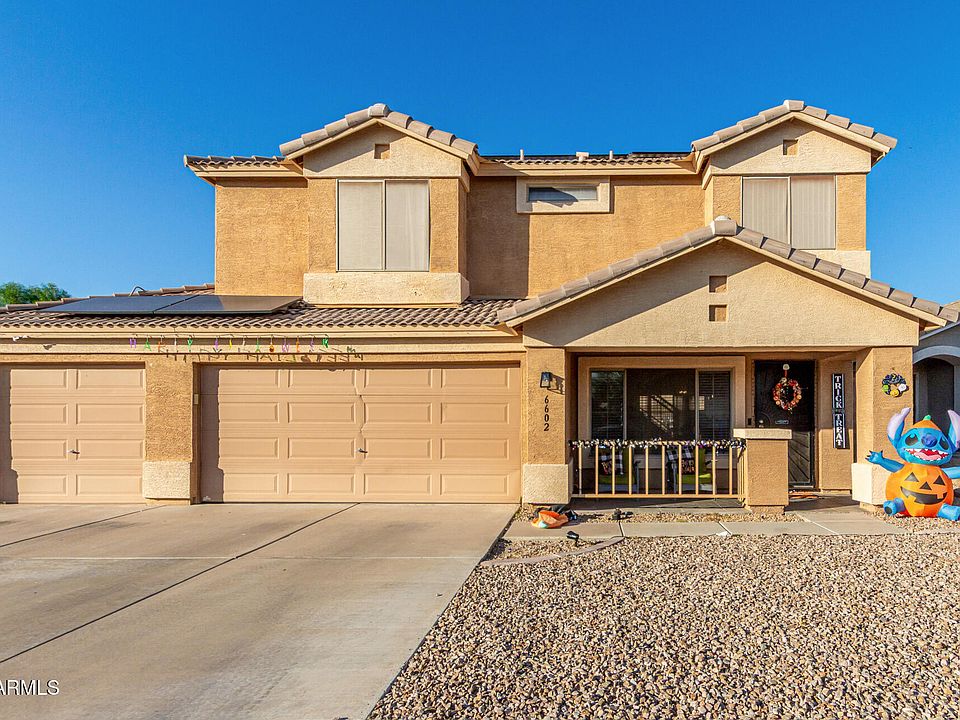 Prepare to be impressed! This stunning two-story home offers comfort, style, and plenty of space to make it your dream home. Enjoy low-maintenance curb appeal and a 3-car garage. Step inside to a bright, welcoming interior boasting a neutral color palette, 3 spacious bedrooms, 2.5 bathrooms, and a cozy upstairs loft — perfect for a home office or media space. The well-maintained kitchen is a cook's delight, showcasing new granite counters, an added breakfast bar, new clean white shaker cabinetry, a walk-in pantry, and sleek appliances. Retreat to the double-door primary suite, complete with a large picture window that fill the room with natural light, a walk-in closet, and a pristine ensuite bathroom featuring dual sinks. Step outside to a generous backyard with lush green grass, an extended covered and a storage shed ideal for relaxing or entertaining family and friends. This home truly has it all space, comfort, and charm ready for you to move right in!