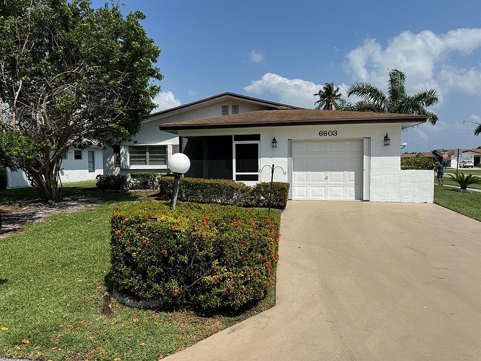 Discover this beautifully renovated Single-Family home perfectly situated on a spacious corner lot. This bright and inviting residence offers 2 bedrooms, 2 bathrooms, a 1-car garage, and two screened patios which is ideal for relaxing or entertaining. Step inside to a spacious master suite with a huge walk-in closet plus an additional closet. The stunning white kitchen features modern appliances and sleek quartz countertops. Both bathrooms have been completely remodeled with new cabinetry, stylish fixtures, and contemporary showers. A full-size washer and dryer add everyday convenience. Residents of Delray Villas enjoy resort-style amenities, including Bocce, Horseshoes, Pickleball, and Tennis Courts, along with a large heated swimming and lap pool. Stay active in the co-ed gym, equipped with state-of-the-art fitness machines and locker room facilities. A variety of clubs and social activities provide endless opportunities to connect and enjoy your community. Ideally located close to airports, shopping, dining, and medical facilities, this home offers the perfect blend of comfort and convenience.
