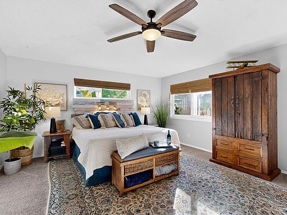 OPEN HOUSE SAT 1:00-3. OWNED SOLAR panels, 2025 Refrigerated Air, natural stone tile floors, neutral carpet, designer tile, open floorplan, custom fireplace: stone & live-edge wood mantle, vaulted ceiling, New/recent: lights, fans, faucets, toilet in primary. The primary en-suite is a luxurious retreat: large walk-in closet, gorgeous cherry wood vanity with double sinks, and custom copper-inlayed barn door. Step outside to your backyard OASIS... lovely patio features built-in grill, granite counters, easy turf, recent gazebo, established garden, water fountains, custom iron gates to back! Nearby park is walking distance with sidewalks. Convenient to Freeways, shops & restaurants! Environmentally friendly and cost-efficient; Utility records available upon request. MORE: