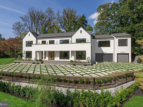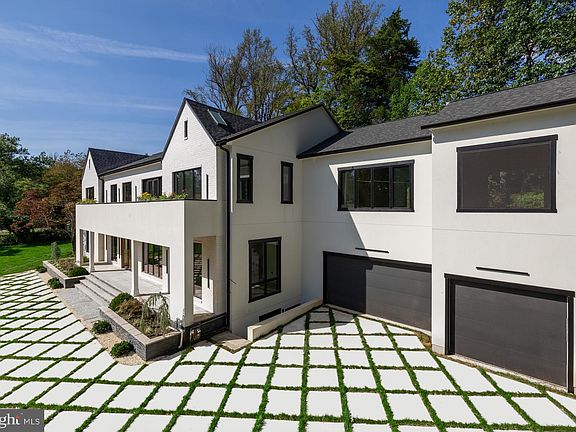 Tucked within a serene cul-de-sac in Bethesda’s coveted Burning Tree neighborhood, 6605 Lybrook Court represents the latest collaboration between renowned builder Dena House and AP Architects. Recently completed on over half an acre, this custom contemporary residence spans more than 9,000 square feet across three thoughtfully designed levels, offering a rare combination of modern sophistication, enduring craftsmanship, and flexible living spaces. Defined by clean geometry and finely curated materials, the home balances sleek modern elegance with lasting comfort. The striking façade, composed of Shouldice dimensional stone and white concrete and accented by black-clad Pella windows, is approached via a custom concrete block driveway with grass in between, providing parking for up to nine cars. A dramatic 25-foot-wide staircase leads to a 300-square-foot covered terrace with a luxury mahogany ceiling, framing the glass pivot front door and soaring double-height foyer. Inside, a floating Viewrail staircase with four-inch treads and glass railings ascends before a 21-foot paneled red oak wall, creating the home’s architectural centerpiece. Expansive sightlines and abundant natural light connect formal and informal spaces seamlessly. The formal living and dining rooms flow effortlessly, while a distinguished study with custom millwork, dual built-in libraries, red oak–paneled walls, and a private exterior entrance provides an elegant and functional space for work or reflection. The informal living area centers on a family room anchored by a striking gas fireplace within a porcelain and marble surround, framed by panoramic views of the rear terrace. Throughout the main level, 7.5-inch white oak floors, Visual Comfort lighting, and Lutron smart controls create a cohesive atmosphere of sophistication. The home is equipped with Bose and Polk sound systems, with 11 speaker pairs delivering immersive audio throughout. The kitchen is both a statement and a sanctuary, featuring two-tone Wood-Mode cabinetry, Calacatta Silver quartzite surfaces, a waterfall island, a custom hood, and a full Wolf/Sub-Zero appliance suite. A butler’s pantry and walk-in secondary pantry provide abundant storage and prep space. A mudroom connects to the three-car garage and family powder room, while a main-level guest suite enhances multigenerational flexibility. Upstairs, the primary suite is a retreat of exceptional comfort, with poplar-beamed ceilings, red oak paneling, dual custom walk-in dressing rooms (one with a Taj Mahal-topped island), and a private sitting room with kitchenette opening to a screened porch with a mahogany ceiling. The spa-inspired bath features a Negresco leather granite double vanity, Tappeti marble, Badeloft soaking tub, and expansive glass shower. Three additional bedrooms, each with ensuite baths and custom walk-in closets, surround a loft sitting area, with a conveniently located laundry room. The lower level is devoted to recreation and relaxation, featuring a home cinema with 6.1 surround sound, glass-enclosed wine room, fully equipped bar and kitchenette, fitness center, and guest suite with full bath. A Savaria Eclipse elevator provides seamless access to all three levels. Outdoors, two metal pergolas define distinct gathering areas, one anchored by a natural gas fire table. Custom concrete hardscaping and lush landscaping create a private, serene setting ideal for intimate dining or larger entertaining. Smart home systems, including Ring security, Nest thermostats, and WiFi-enabled appliances, integrate convenience and efficiency into daily life. With meticulous craftsmanship, modern design, and a premier location blending tranquility with proximity to downtown Bethesda, 6605 Lybrook Court offers a rare opportunity to own a newly built residence of architectural distinction, where every detail reflects comfort, style, and timeless sophistication.