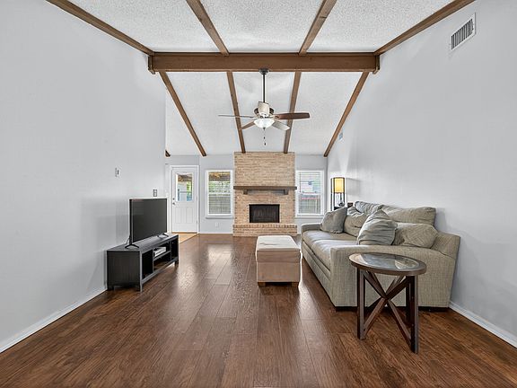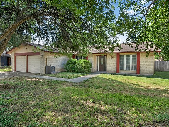 Inviting 1-story home with 3 bedrooms and 2 bathrooms, located off New World Dr. The spacious living area features high ceilings and a cozy fireplace, creating a welcoming atmosphere for family and guests. The eat-in kitchen is equipped with white modern cabinets and appliances, along with a separate dining area, perfect for everyday meals or entertaining. The primary bedroom boasts high ceilings and a full bath with a single vanity and tub/shower combo, offering both comfort and functionality. All bedrooms are thoughtfully positioned toward the back of the home for added privacy. The backyard is designed for enjoyment and convenience, featuring a large covered patio, a dog run, a shed, and a fully fenced yard, making it ideal for pets, outdoor gatherings, or simply relaxing. This home is conveniently located just 15 minutes to Randolph AFB, a quick drive to HWY 1604, and close to shopping, restaurants, and major roads, combining comfort, style, and accessibility in one desirable package.