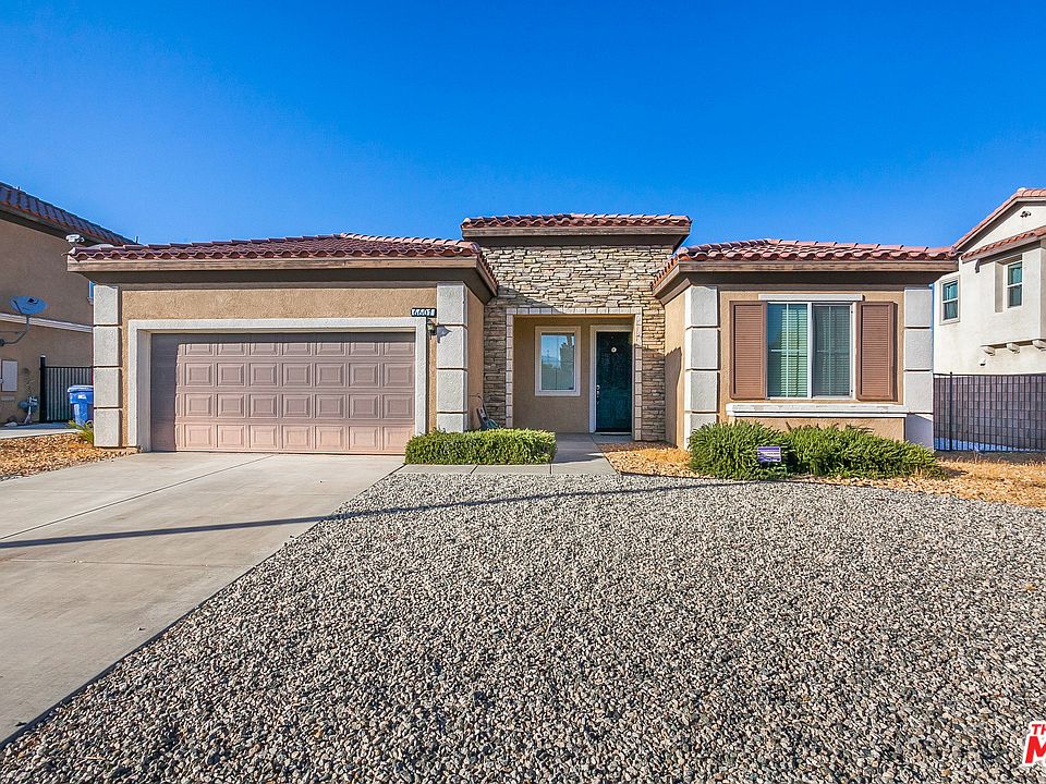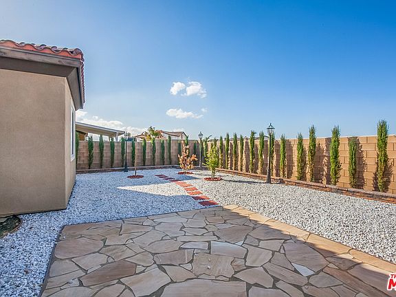 Spacious traditional 3+2 home built in 2007 w/ extra high ceilings. Great kitchen w/ plenty of cabinet space, center island w/ breakfast bar w/ tiled countertops. Open living room w/ fireplace and formal dining area. Outdoor patio has been upgraded with flagstones and covered by gazebo w/ lighting. Master BR with en-suite tub and shower bathroom, walk-in-closet, toilet separated. 2 additional BR have large closets. Hallway BR has a shower/ bathtub with glass doors. Laundry room off kitchen w/ washer/dryer hook-ups. Add. storage and custom shelving in 2 car garage. Front yard is drought efficiently landscaped. Back yard w/ hedges and trees. Upgrades include: Water filter system, tankless water heater, metall shelving, cabana patio, drought resistant landscaping, irrigation system, ceiling fans/ lights