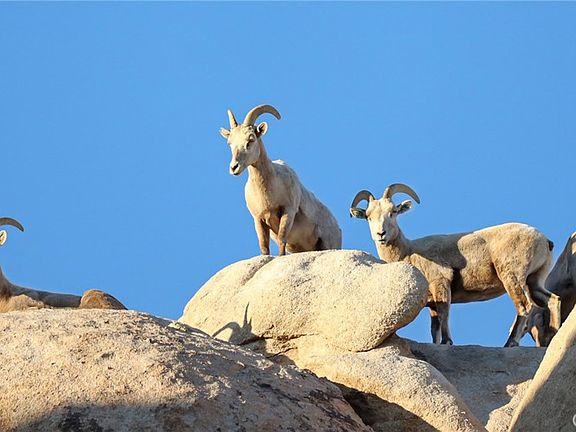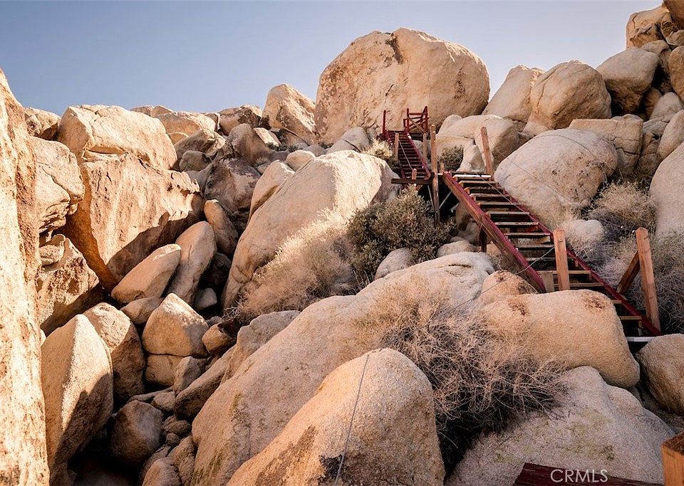STAIRWAY TO HEAVEN: BOULDERS, BOULDERS, BOULDERS. Massive 10-Acre parcel that borders and is adjacent to Joshua Tree National Park. Hike from your own property straight into the Park – or better, camp in your own boulder retreat. Parcel is also adjacent to the Kellogg/Doolittle house – the most significant architectural home locally, which is built into the boulders and provides an example of future possibilities with this parcel. Property includes 3 separate living structures: a 2-bed/1-bath conventional home with a dining/living area that opens up to a boulder surrounded courtyard. A large 1-bed/1-bath geodesic dome with a loft bedroom and spacious living area, in addition to a second-floor deck to relax and enjoy nature. Finally, a modest 1-bed/1-bath cabin. Property is serviced by conventional electric and water (SCE & Joshua Basic Water District water meter) and septic tanks. For additional storage/workshop stands a Quonset hut, made from durable steel. A carport is built into the rocks. Paid solar. Wildlife flourishes on the property, including big horn sheep (all animal pictures were taken on the property). Few properties touch the National Park and even less are this large in size and this many rock outcroppings. One could lead private yoga retreats in your own private hidden valley, or meditate solo. Countless possibilities for a property as significant, profound and sublime as this extremely rare holding.