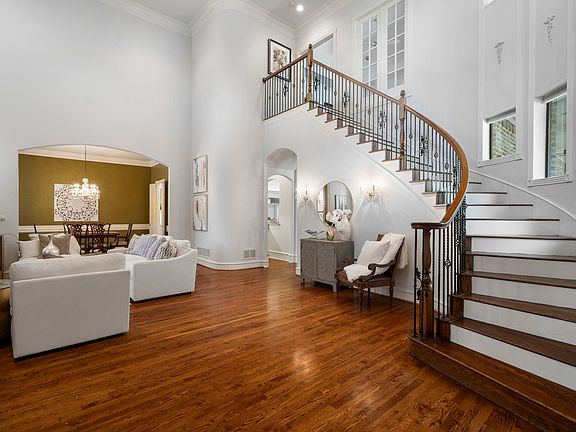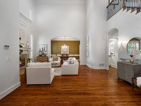 Inside, nearly 5,000 square feet of thoughtfully designed living space unfold with warmth and sophistication. Rich hardwood floors, soaring 20-foot ceilings, and a dramatic staircase set the tone for refined living. The main level features the primary suite and an additional bedroom—perfect for guests or multigenerational living.