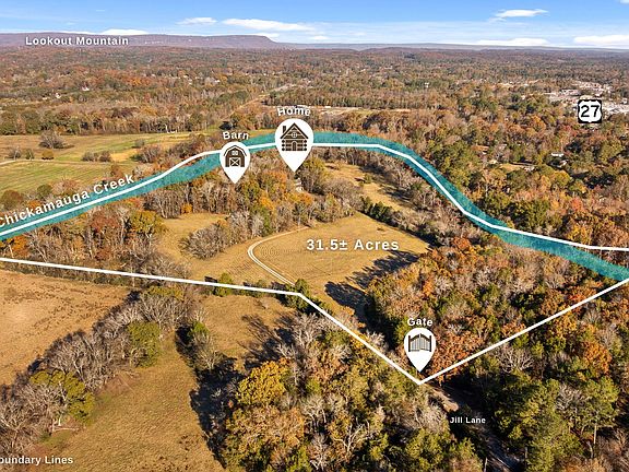 WATCH VIDEO: https://youtube.com/shorts/YgpMRlTM75A?feature=share - A TRULY UNIQUE OFFERING in North Georgia! Experience the timeless appeal of this HISTORIC 1800s log home, peacefully situated on 31.5± acres featuring open pastures, a flowing creek, and exceptional seclusion. Just 1 turn from Hwy 27, this property offers exceptional convenience while preserving tranquility. Just 1 turn from Hwy 27, this property offers exceptional convenience while preserving the tranquil seclusion of North Georgia. The 2-level home immediately charms with stone steps leading to a foyer crowned by a marvelous stained-glass window. Character continues throughout the main level with exposed wood beams, 6 FIREPLACES, a primary bedroom and bathroom, and spacious living room. The kitchen recalls the warmth and comfort of simpler days, framed by a colonial hearth fireplace for open-fire cooking and a classic Dutch door. Upstairs, you'll find 3 additional bedrooms ready to be shaped to your vision. 3 covered porches invite you to settle in with a porch swing and take in the sounds of birdsong, roaming wildlife, and the gentle rustle of leaves. The land is equally captivating: 3,600± feet of CHICKAMAUGA CREEK gracefully wrap around the property, enhancing natural beauty and agricultural potential. Rolling pastures, mature hardwoods, and a mix of open and shaded acreage. The landscape is versatile, ideal for livestock, gardening, horseback riding, or even future venue or working farm possibilities. A large BARN, small shed, and historic horse MOUNTING ROCK further anchor the property's agricultural heritage. Evenings by the FIREPIT under star-filled skies complete the picture of peaceful country living. The property lies near some of North Georgia's most cherished outdoor spaces, including Crockford-Pigeon Mountain Wildlife Management Area, Cloudland Canyon State Park, and the Chattahoochee National Forest, offering miles of riding, hiking, caving, and wildlife exploration. Though wonderfully private, you're just 15 minutes to Chickamauga's quaint town center, Chickamauga National Military Park, and Fort Oglethorpe. 30 minutes to downtown Chattanooga! A truly timeless retreat rich with history, natural beauty, and inspiring potential. 661 Jill Lane is ready to welcome its next chapter! Schedule your private showing today and experience North Georgia at its finest.30 minutes to downtown Chattanooga! A truly timeless retreat rich with history, natural beauty, and inspiring potential. 661 Jill Lane is ready to welcome its next chapter! Schedule your private showing today and experience North Georgia at its finest. (If Buyer elects to remove property from Conservation Covenant, Buyer to be responsible for the full payment of any and all rollback taxes. Buyer to verify square footage. Some images may be virtually staged. Buyer is responsible for doing their due diligence to verify that all information is correct, accurate, and for obtaining any and all restrictions for the property deemed important to Buyer.)