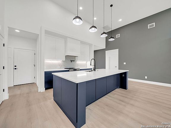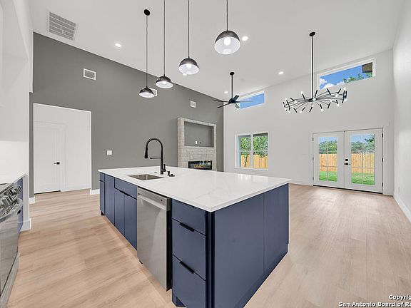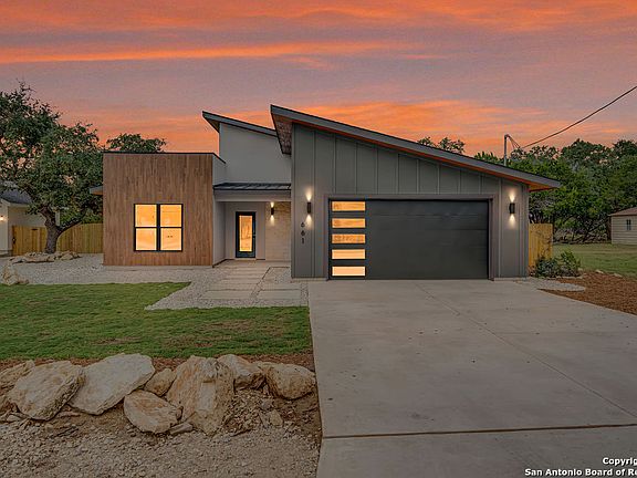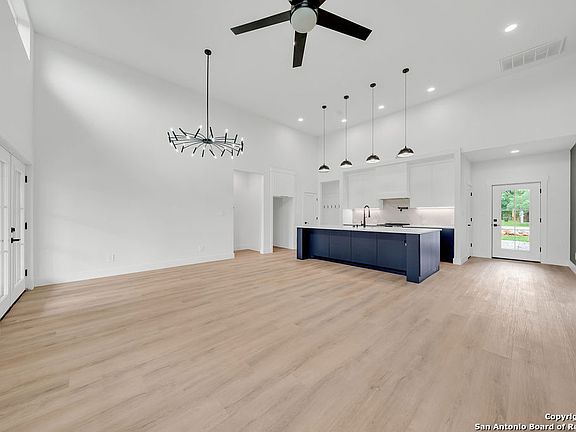 Builder Incentive - Money Toward Buyer Costs! Buy Down Rate! Brand-New Modern Home in Cypress Cove - Designed by Dionne Architects! Step into sleek modern living with this newly built 3-bedroom, 2-bathroom, 1,625 sq. ft. home. Designed by Dionne Architects, the home boasts 14-ft ceilings in the living, dining, and kitchen areas, filling the open-concept layout with natural light. The chef's kitchen showcases quartz countertops, custom two-tone cabinetry, and a large island. The spacious living room features a stone-accent wall with an electric fireplace-perfect for gatherings or quiet nights in. The owner's suite offers a spa-like bath with a sleek vanity, a frameless glass walk-in shower, and modern finishes throughout. Additional highlights include luxury plank flooring (no carpet), black fixtures, spacious secondary bedrooms, and a covered back patio overlooking the private yard. A large driveway and 2-car garage provide ample parking. Located in Cypress Cove Section 11, this home blends modern design with Hill Country charm, just minutes from Canyon Lake, shopping, dining, and Hwy 281.
