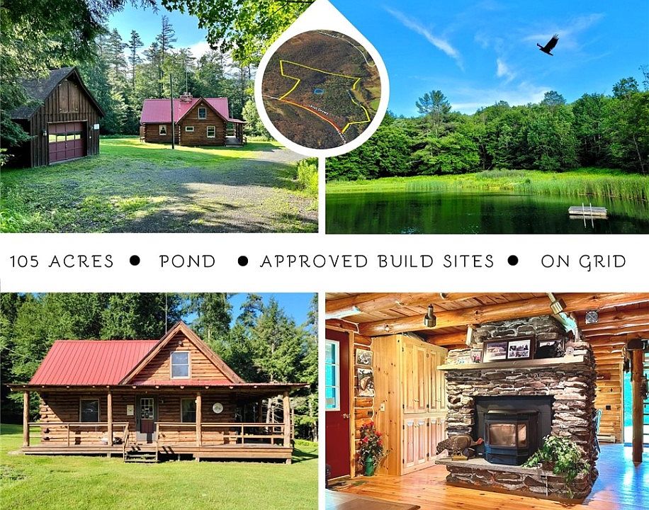 This expansive and diverse lot is comprised of 4 separate parcels totaling 105 acres. A gated entrance bounds two main drives boasting equally serene endpoints. Head down to the LOG cabin on a gently sloped drive with thoughtful bends & considerately placed culverts. Or take the drive less traveled (but still approved for something more formal), to the serenity of a ONE ACRE SIZED 15ft deep POND with a cleared circumference large enough to drive on, watch tower, & APPROVED BUILD SITE.