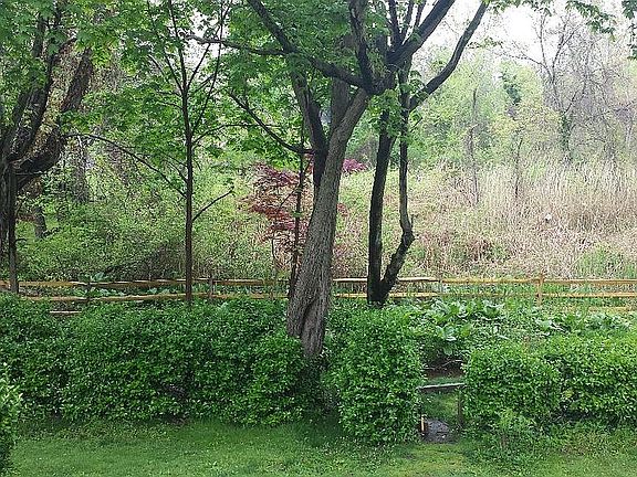 Beautifully landscaped, private bilevel. Back yard is surrounded by a new post and rail fence, lined with vinyl clad wire, providing an attractive and safe place for pets and children. The front is adorned with wisteria, along with dogwood and cherry trees. Lilacs, forsythias, euonymus, and apple trees can be found throughout. Pear trees and a grape arbor supporting Concord and Niagara grapes that grow throughout the summer can be found in back. The main floor is all hardwood. A large living room adjoins a formal dining room. Glass sliding doors provide access to a 25' x 13' natural wood deck with built in wooden table/booth, overlooking a beautiful open natural setting. The eat in kitchen w/pocket door, full bath w/heat lamp, and three of the bedrooms are on the main floor. The remaining two bedrooms, currently used as an office and gym, and one half bath are downstairs. An 80” x 57” picture window downstairs looks out onto a private covered flagstone patio. A spacious, shelved utility room with large (removable) built-in work bench, washer, and dryer are adjacent to the garage, which also has shelves. The Genie garage door opener has a lifetime warranty. Convenient additional closed in storage area is downstairs. Heat is gas / hot water baseboard. 9'4”x14'8” and 8'3”x14'3” 12*