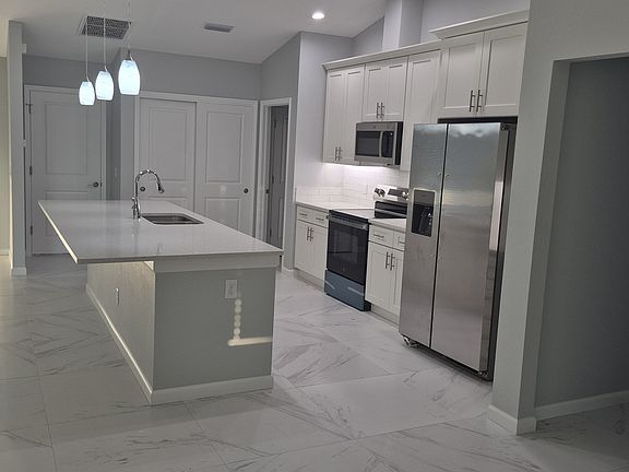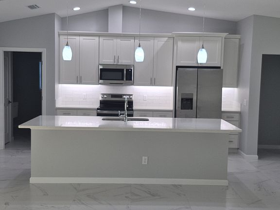 Beautiful brand-new 3BR/2BA home in the Murdock area of Port Charlotte. This never-lived-in home offers 1,729 sq ft of open-concept living (2,400 sq ft under roof) with 30" porcelain tile throughout, quartz slab countertops, and tiled showers with recessed shelves. Built to impact-rated standards for hurricane protection. The modern kitchen flows into a bright living area, perfect for entertaining. Enjoy an oversized garage, plus a large screened-in lanai ideal for relaxing outdoors. Close to shopping, dining, parks, and everything Port Charlotte offers.