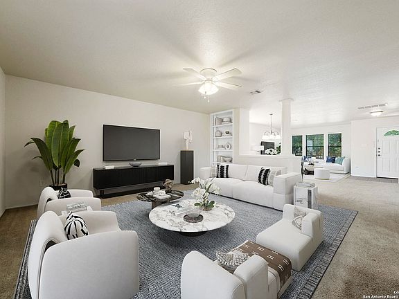 Welcome to the well-established neighborhood of Auburn Hills at Woodcrest, where the epitome of suburban living meets comfort and elegance. This impeccable 4 bedroom, 2.5 bath residence is a must-see, boasting a prime location just steps away from the neighborhood park and playground. Upon entry, prepare to be captivated by the luminous, open floor plan adorned with two expansive living areas and a formal dining room, ideal for hosting gatherings or enjoying everyday family meals. The eat-in kitchen is a chef's dream, offering an abundance of cabinet and counter space, a sizable walk-in pantry, and a generous island perfect for meal prep or casual dining. The kitchen flows effortlessly into the family room, creating a cohesive and inviting atmosphere for everyday living. Venture upstairs to discover the impressive primary suite, featuring not one, but two walk-in closets, ensuring ample storage and organization. The primary bath is a sanctuary of luxury, featuring dual separate vanities, a soothing garden tub, and a separate walk-in shower. Three additional bedrooms upstairs provide ample space for family, guests, or home office needs. Outside, the backyard oasis beckons with a generous covered patio, mature trees providing shade and privacy, and plenty of room for outdoor recreation and entertainment. Home is situated on a greenbelt lot for those looking for that extra privacy. Conveniently located with easy access to RAFB, Ft Sam, I-35, and local shopping and dining destinations, this home offers the perfect blend of convenience and comfort. Don't miss out on the opportunity to make this beautiful residence your own. Schedule your showing today!