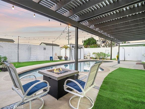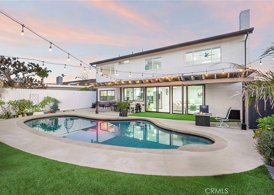 Nestled in one of Huntington Beach’s most highly sought-after neighborhoods, this beautifully renovated home perfectly blends modern luxury with everyday functionality. Step inside to find a home that feels brand-new, with every detail thoughtfully designed for style, comfort, and entertaining. The elegant entry features a spiral staircase that gracefully separates the formal and casual living spaces. To one side, a light-filled living room welcomes guests; to the other, a cozy family room with a modern gas fireplace wrapped in striking black porcelain tile — mirroring the sleek black quartz countertops and backsplash in the adjacent kitchen. The chef’s kitchen offers abundant storage and top-of-the-line appliances, including a six-burner range, smart refrigerator, microwave drawer, and a beverage fridge for effortless hosting. Dual sliding glass doors connect the indoor living areas to a private backyard retreat, where a covered patio provides shaded comfort and an inviting space to relax by the newly resurfaced saltwater pool. The pool sparkles with an abalone pebble-tec finish, and all new pool equipment. The artificial turf and updated hardscape keep maintenance to a minimum — so weekends are for lounging! One of the best features is the main-level bedroom with a full bath, offering a flexible second primary suite for multi-generational living, or guests. Upstairs, the primary suite is a true sanctuary, featuring a spa-inspired bathroom with a freestanding soaking tub, a walk-in shower, and a large closet. The fifth bedroom is currently open to the primary, making it perfect as an additional closet or office—or easily convert back to a full bedroom if desired. Recent upgrades over the past two years include new porcelain tile flooring, Milgard windows and sliding doors, a new electrical panel, tankless water heater, and fresh interior finishes throughout. The oversized two-car garage offers ample storage above and built-in shelving, plus a convenient balcony overlooking the front of the home. Just a short walk from Huntington Central Park and Lake Huntington, you’ll enjoy the very best of outdoor recreation — all while being minutes from world-famous beaches and local favorites like Pacific City, Bolsa Chica Wetlands, and the Central Park Sports Complex. From its designer finishes to its unbeatable location, this Huntington Beach gem delivers the ultimate Southern California lifestyle — where luxury meets coastal charm.