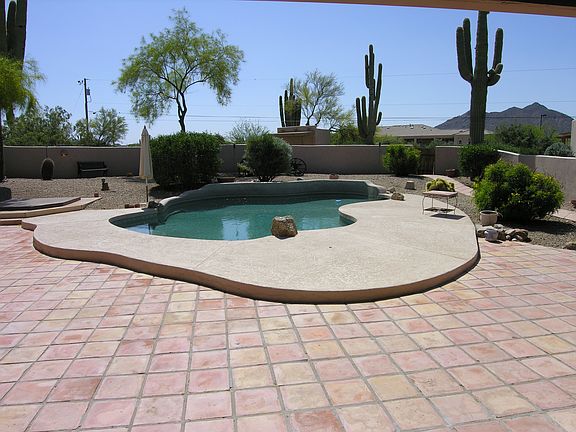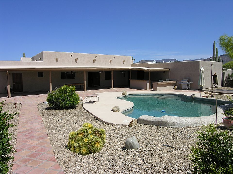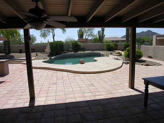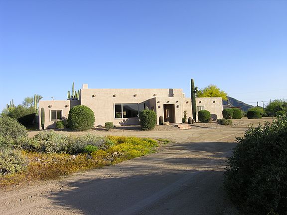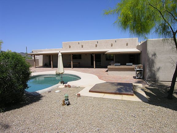 Fabulous wide open views of Elephant Butte, Black Mesa, and Skull Mesa. Spacious main house with 2 bedrooms, 2 full baths, 3/4 bath in garage, updated kitchen, bathrooms, and great room. 2 car garage with washer and dryer, washer/dryer combo in master bath. Pebbletec pool, huge patio with outdoor kitchen. 2 bedroom guest house with 2 full baths, full kitchen,refrigerator and TV included. House, guest house and pool area walls have been recently painted. Everything is neat, clean, and well maintained. Small tack building where corral used to be. Flat lot so it's easy to put in a corral and horse stalls. Great location near many horse trails, great mountain views. Plenty of room for parking horse trailers and RVs with easy in and easy out.