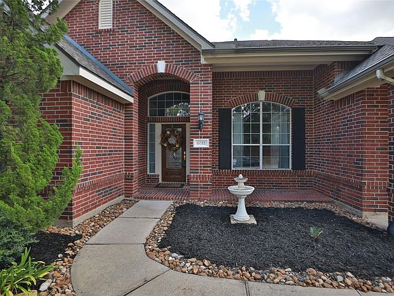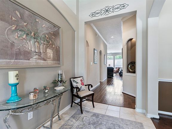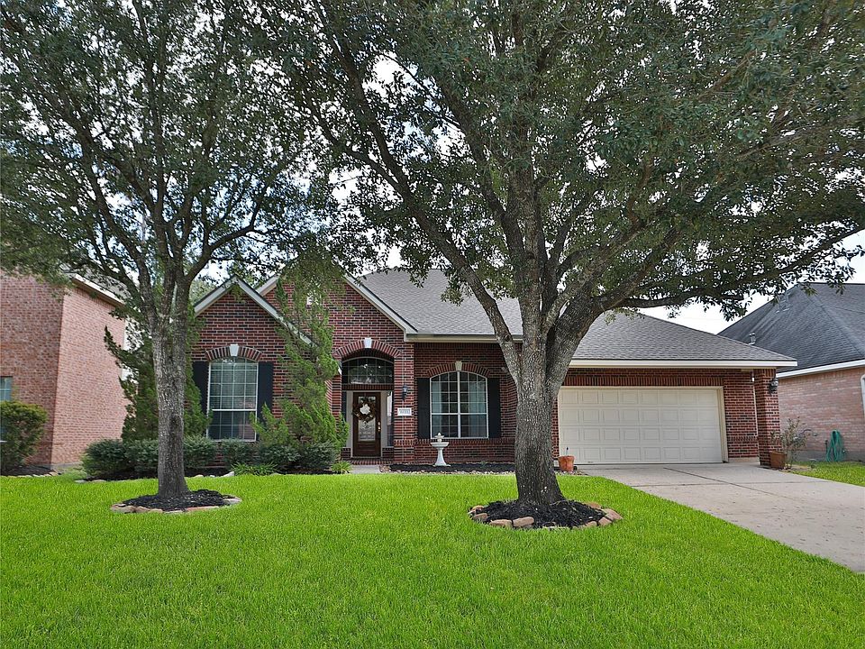 Stunning all brick one story backing to a private greenbelt, wrought iron fence and an enlarged covered patio. This home boasts of wide plank hardwood floors in family room, dining, one bedroom and hallway, soaring ceilings, crown molding, walls of windows, gas fireplace, 3 car tandem garage, split plan, alarm, sprinkler and more. The island kitchen has stainless appliances, natural 42 inch cabinets, quartz countertops, tile backsplash, breakfast bar, expansive cabinets, and opens to the breakfast and family rooms. The primary bedroom has a sitting room, vaulted ceiling, huge walk in closet, and bath with jetted tub, separate shower, double sinks, vanity and is light and bright. The split plan with generously sized rooms is great. This well maintained home has a one year old roof. Windrose is a master planned community with golf course, golf clubhouse, 2 pools, lighted tennis courts, pickle ball courts, trails, lake, and parks scattered throughout.