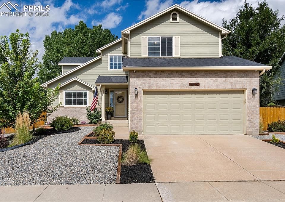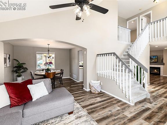 Welcome to this beautifully maintained 2-story home tucked inside a well-established neighborhood. With all 4 bedrooms upstairs, this floor plan is both functional and family friendly.  Step inside to soaring vaulted ceilings that flow through the main living area, creating an open, airy feel. The dining room is enhanced by a charming architectural accent, adding character and style. The updated stairwell with its clean lines and angles creates a striking focal point as you move through the home.  On the north side, the kitchen and family room overlook the backyard oasis, separated by a breakfast bar—perfect for casual dining or entertaining. Recessed lighting and ceiling fans throughout provide warm ambiance and efficiency, while the main level also offers a convenient laundry area and a stylish guest bath.  As you wonder outdoors and you’ll find an inviting extended patio with gazebo, a raised deck, and multiple areas designed for enjoyment: a grassy lawn, playset area, cozy firepit, and a huge dog run with storage shed and even a huge garden area if you choose. The layout of the lot gives a sense of privacy and space, while the xeriscape front yard ensures year-round curb appeal. A gravel pad adds extra off-street parking, and a full sprinkler and drip system keep everything low maintenance.  Upstairs, several bedrooms feature walk-in closets, while the primary suite easily fits a king bed and nightstands. The ensuite bath is a true retreat with an oversized dual-head shower, built-in bench, abundant natural light, dual vanity, and a private water closet.  This home has been thoughtfully updated with a newer furnace, water heater, dishwasher, refrigerator, microwave, fresh carpet upstairs, and a crisp subway tile backsplash that makes the kitchen feel open and modern with expanded counters and cabinetry.  Best of all, this home is move-in ready and just steps from a neighborhood park with quick access to Powers Blvd, shopping, dining, and more.