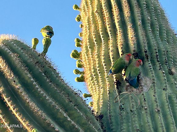 AZ weather in your beautiful backyard with multiple covered patios, and a full size spa, beautiful desert landscaping with a pair of love birds nesting in the