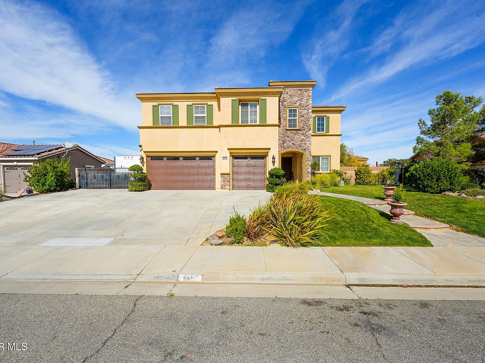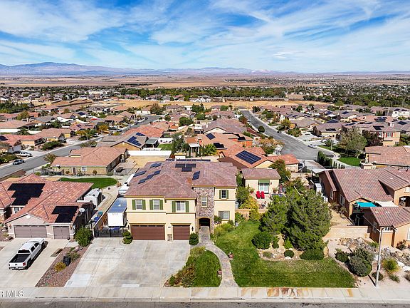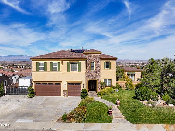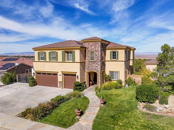 This one-of-a-kind former model home, offered by the original owner, sits in one of the Antelope Valley's most desirable neighborhoods and is zoned for Quartz Hill High. Featuring 3,909 sq. ft. plus a 350 sq. ft. ADU, this home offers flexibility for multi-generational living or an income opportunity. Highlights include a butler's pantry, formal living and dining rooms with soaring 25+ ft ceilings, and a secondary master suite downstairs with a full bath and walk-in closet. Upstairs, the primary suite opens to a walkout patio capturing stunning 300-degree views of the valley, Tehachapi range, and beyond. Enjoy a spacious game room with bar and library, a full outdoor kitchen, fireplace, fire ring, koi pond, and three large seating areas—perfect for entertaining. Energy-efficient with 5,500W of paid solar, dual tankless water heaters, two 5-ton A/C units, and 2x6 exterior walls. True RV access, block walls, and room for a pool complete this exceptional home.
